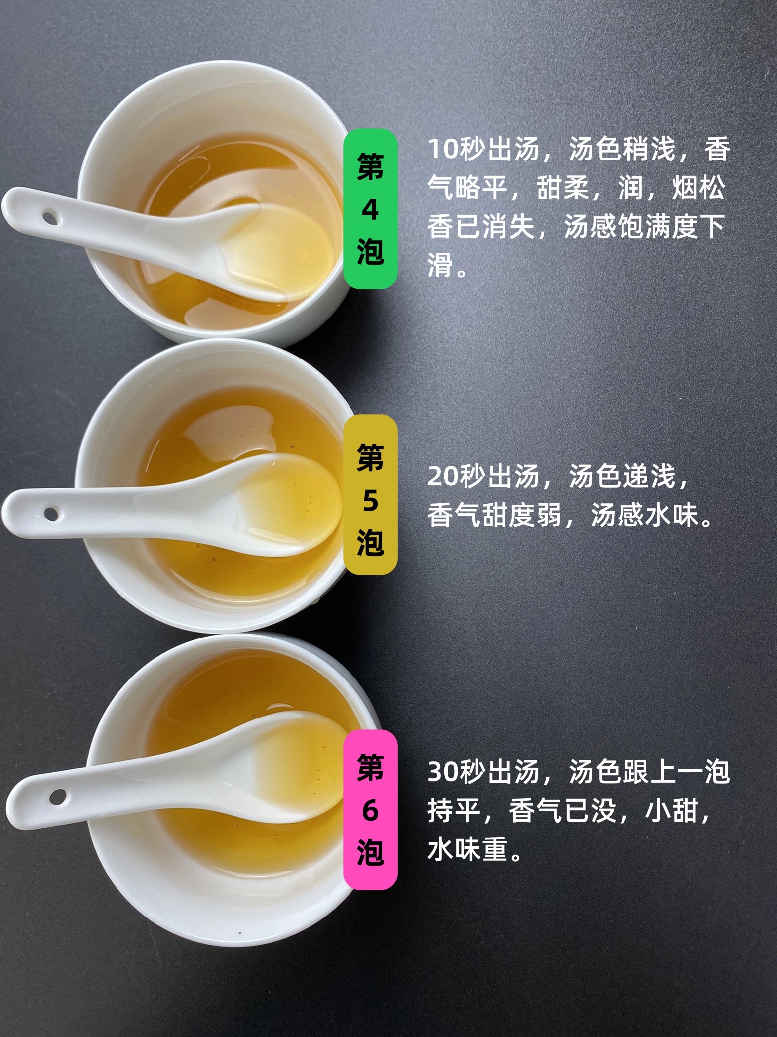 第四泡,10秒出汤,汤色稍浅,香气略平,甜柔,润,烟松香已消失,汤感饱满度下滑。