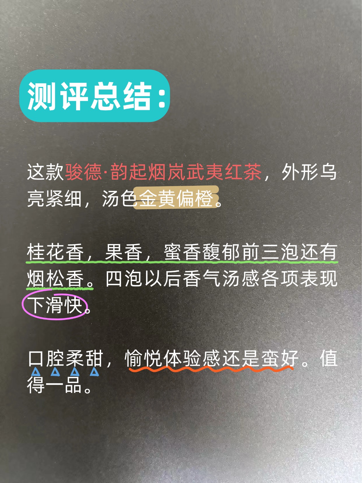 这款骏德·韵起烟岚武夷红茶,外形乌亮紧细,汤色金黄偏橙。桂花香,果香,蜜香馥郁前三泡还有烟松香。四泡以后香气汤感各项表现下滑快。口腔柔甜,愉悦体验感还是蛮好。值得一品。