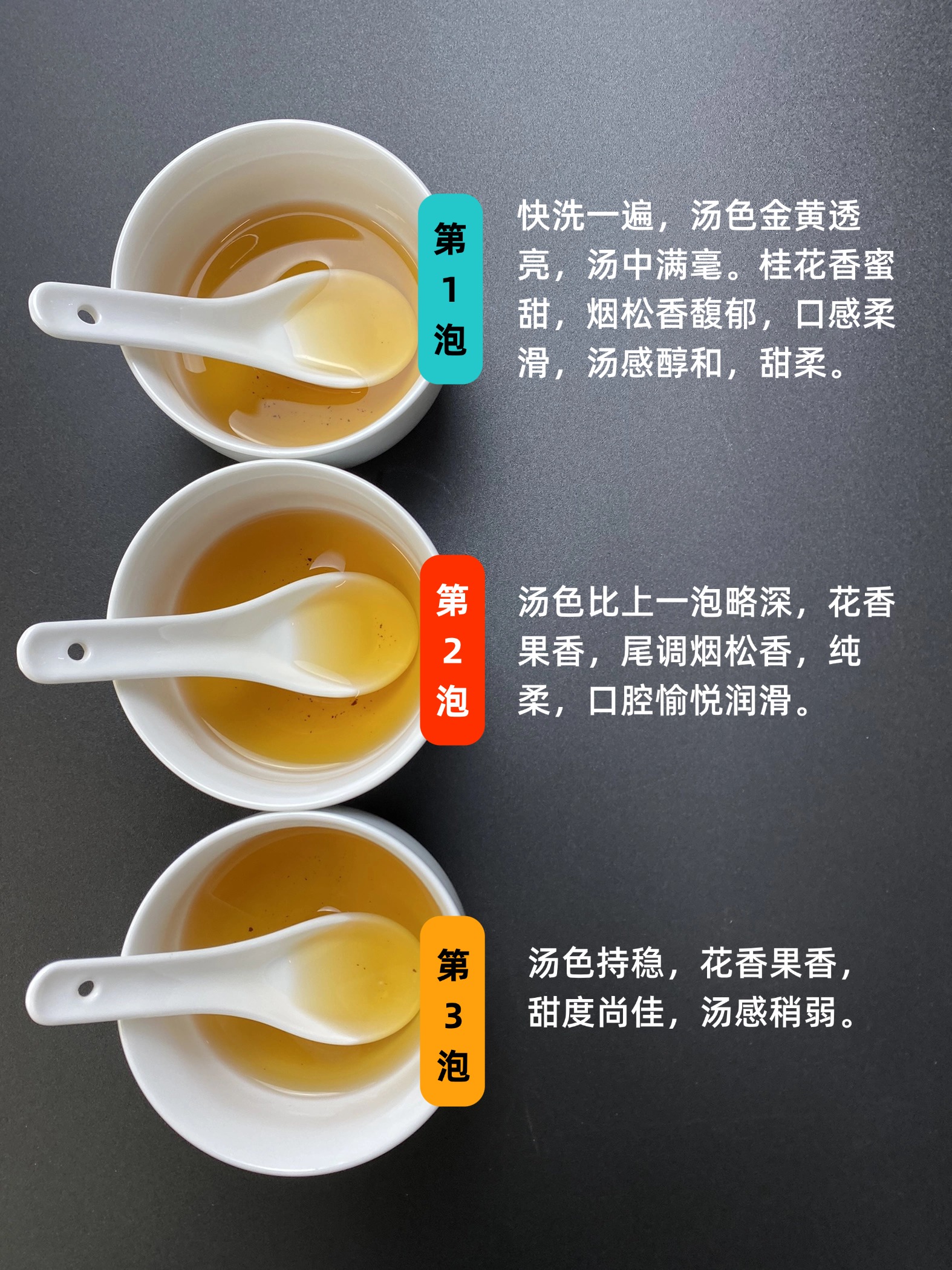 第一泡,快洗一遍,汤色金黄透亮,汤中满毫。桂花香蜜甜,烟松香馥郁,口感柔滑,汤感醇和,甜柔。