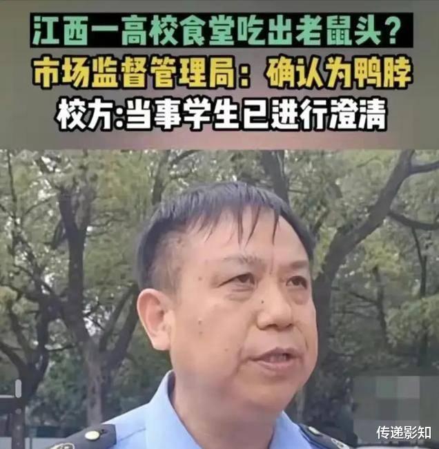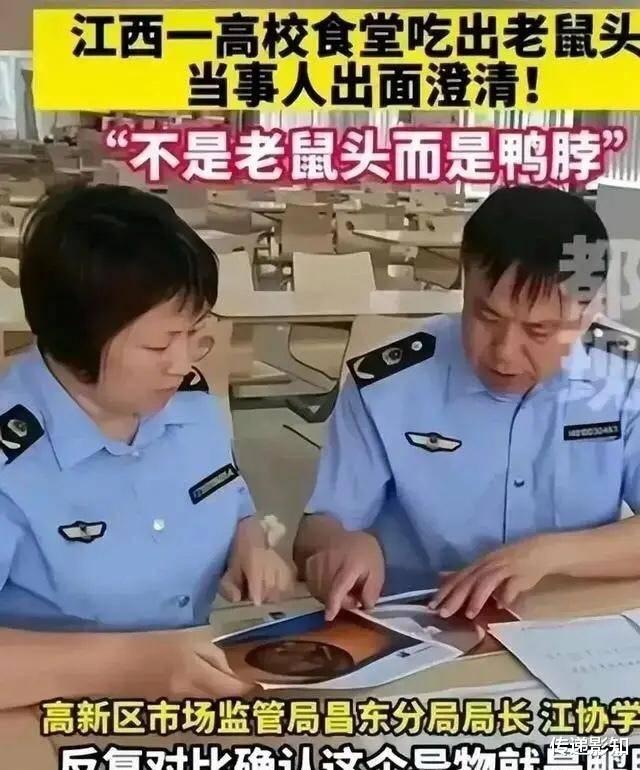 6月17日,经过多日调查,江西“指鼠为鸭”事件的真相是学校食堂在6月1日当天就把异物丢弃,拿真鸭脖误弄市场监督管理局工作人员,拿学业威逼学生澄清,导致市场监督管理局最终下定论“异物为鸭脖”。