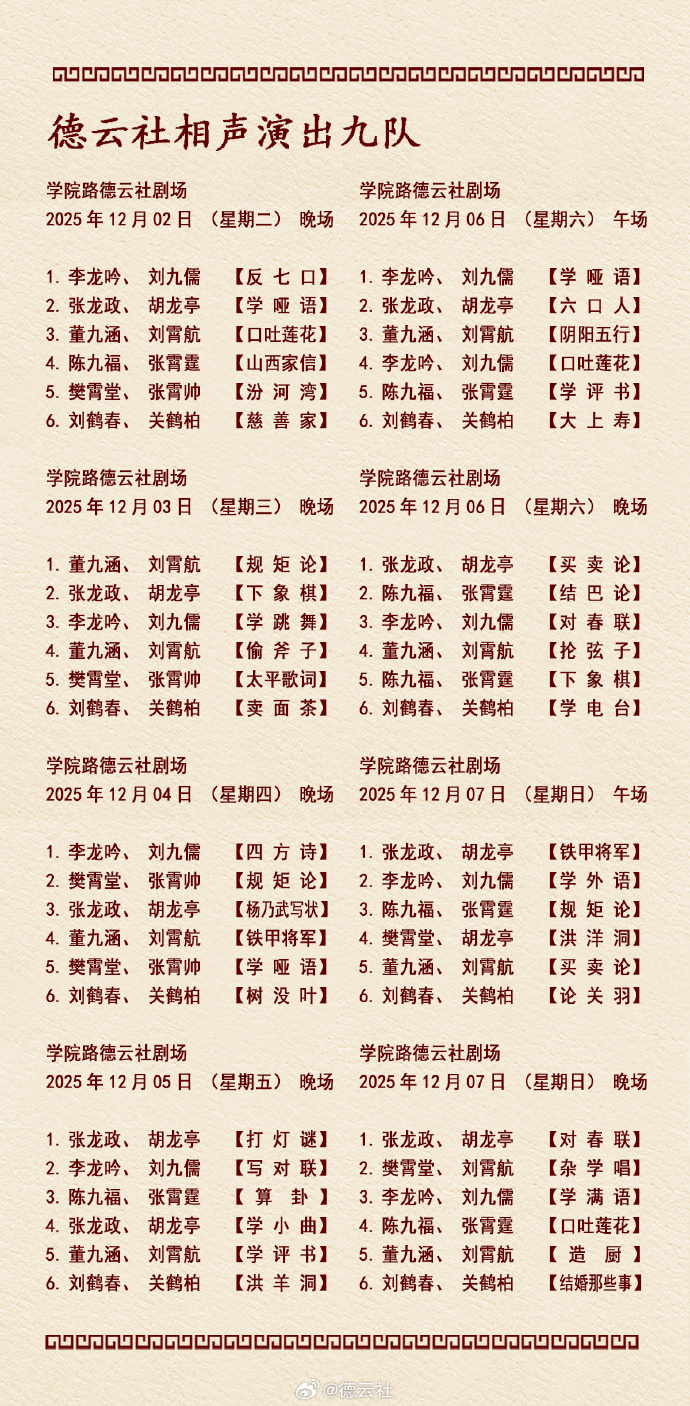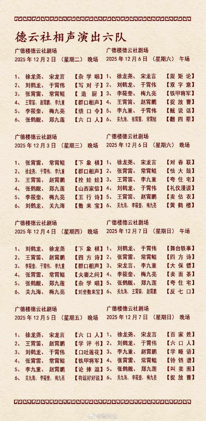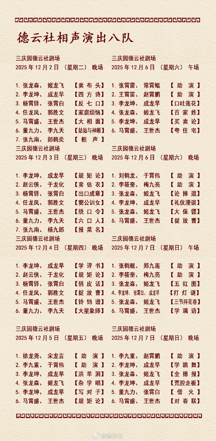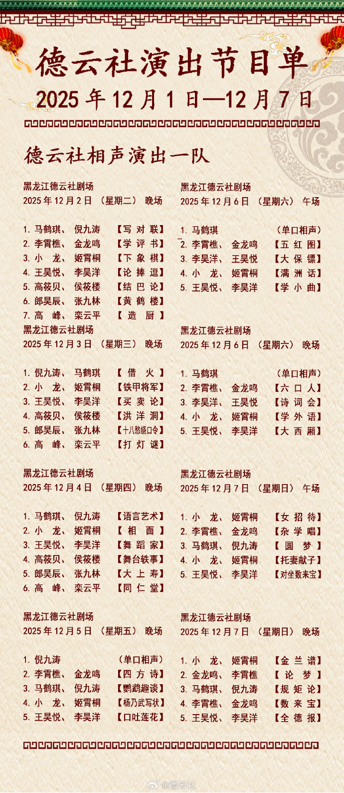 德云社相声演出节目单(2025年12月1日-12月7日 )