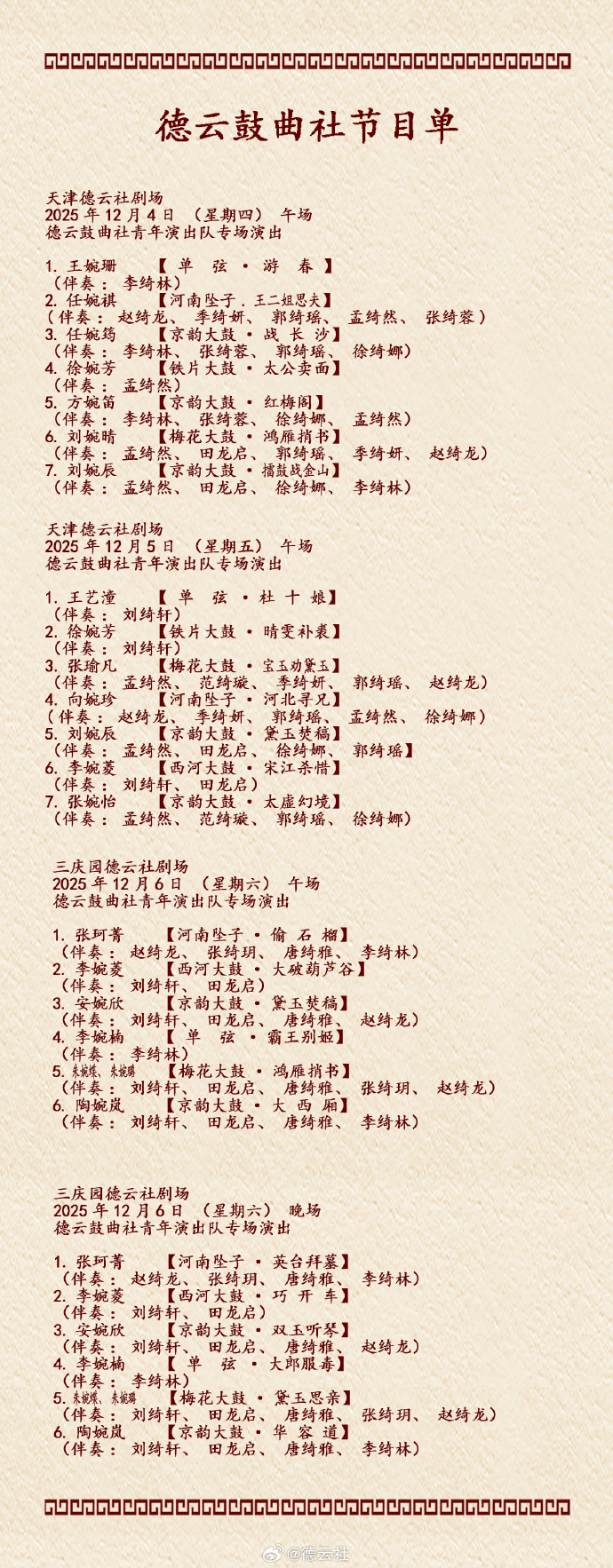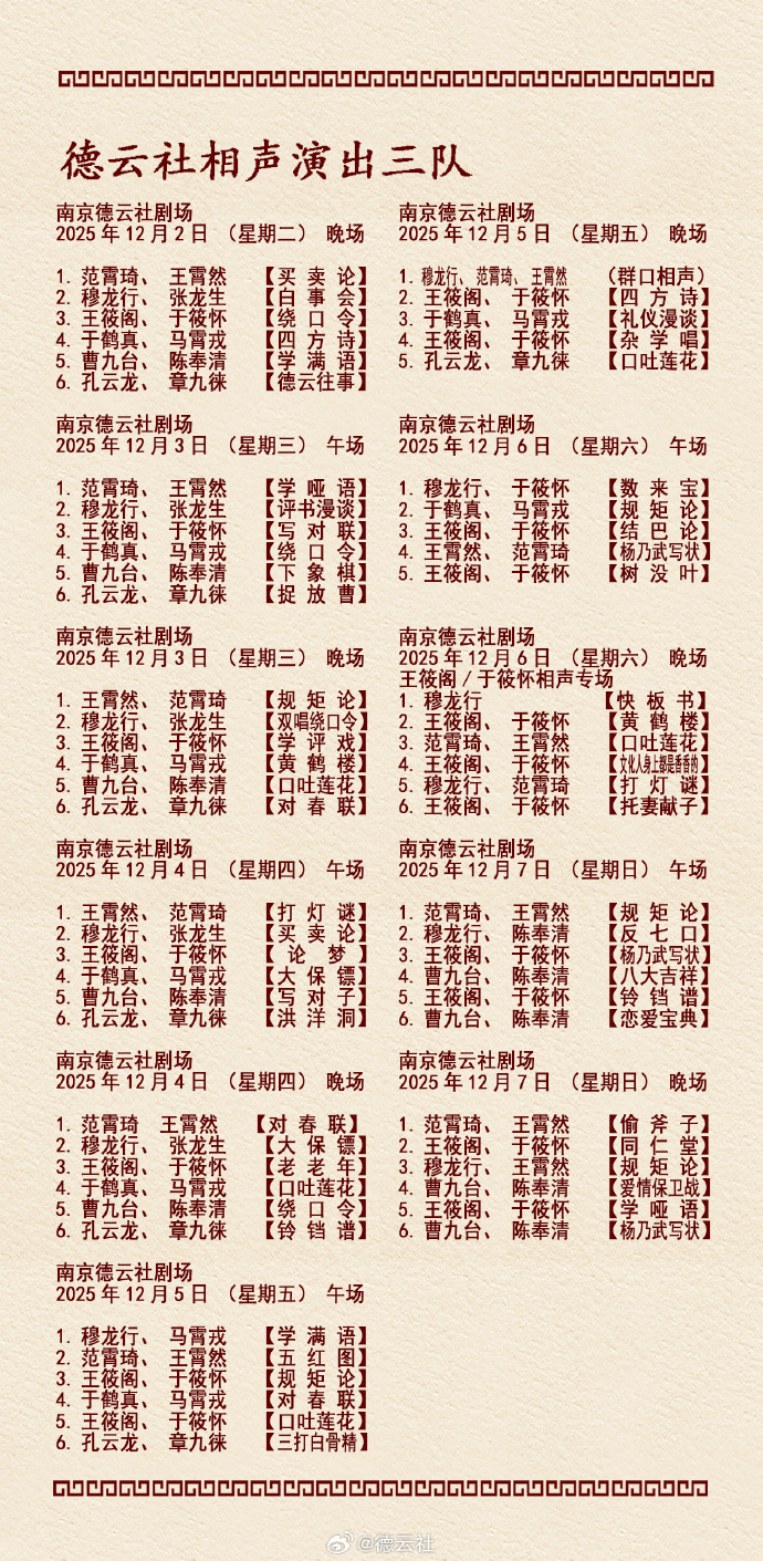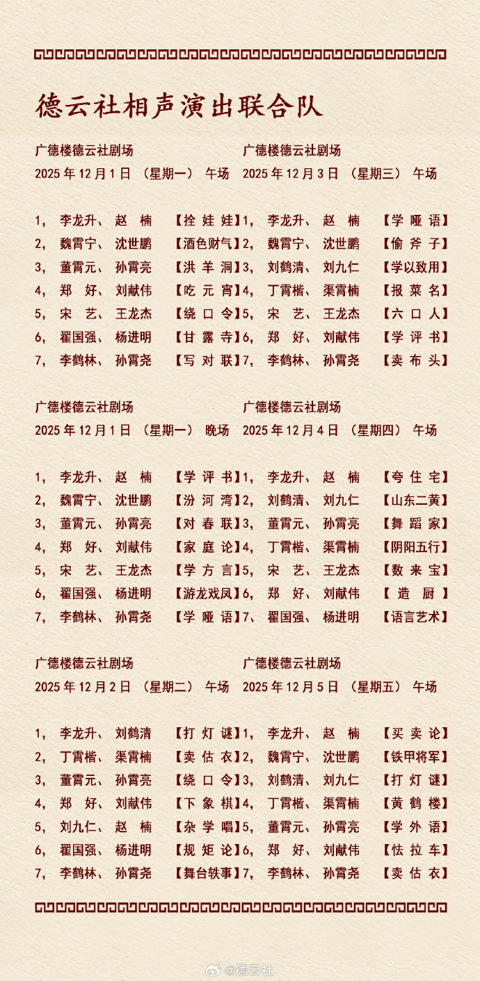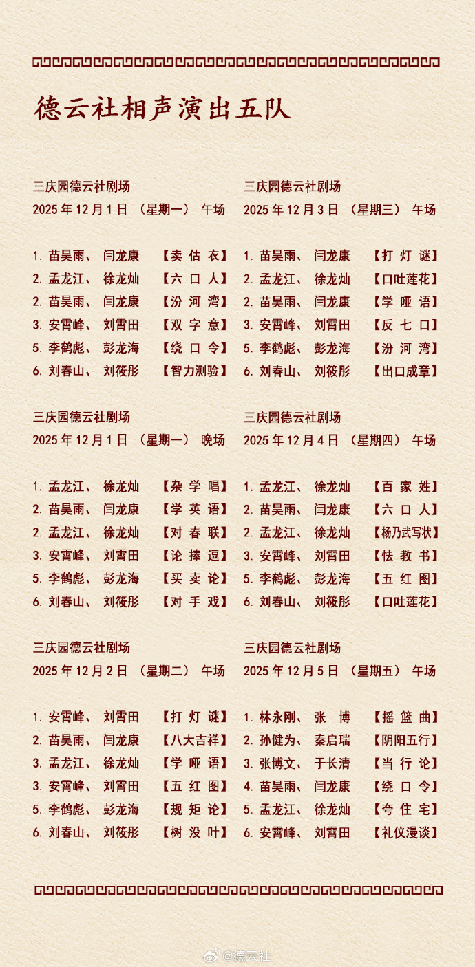 德云社相声演出节目单(2025年12月1日-12月7日 )