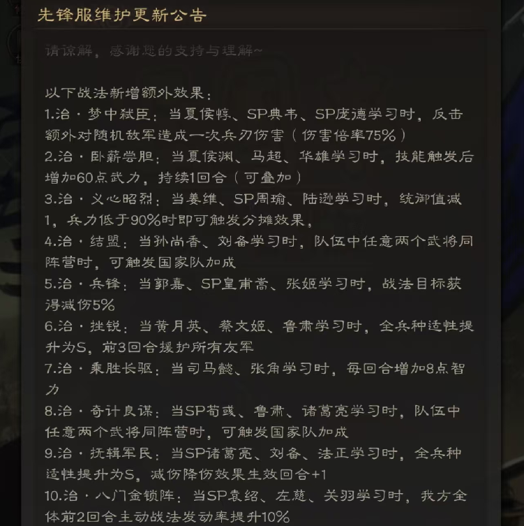 最后,之前玩法可以说不及格的水平,通过本次更新,可以说新剧本可玩性100分的话,至少70分了。如果在10个治战法全更新一下指定武将携带兵种全S,或2+1,那这个剧本可玩性提高到85分。