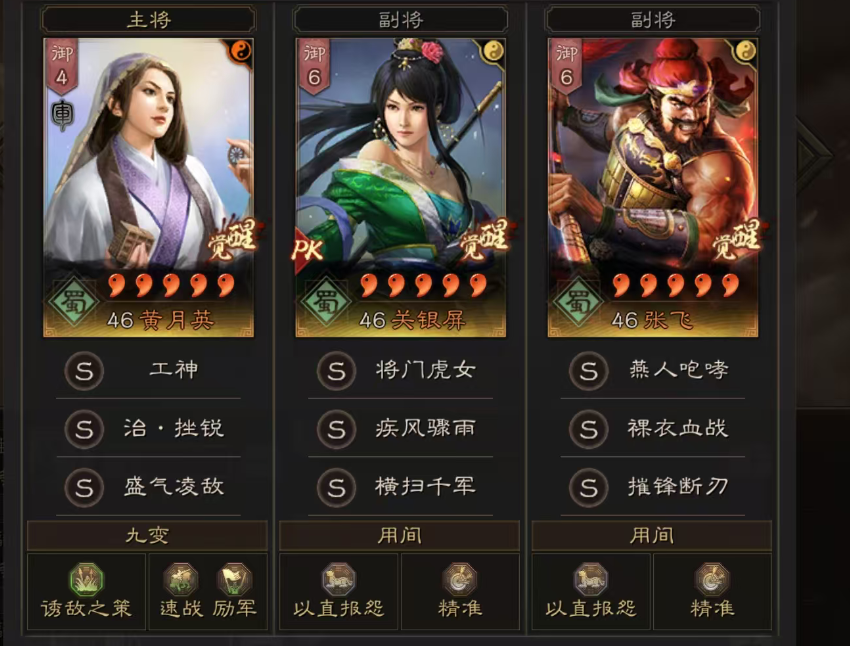 黄月英、蔡文姬、鲁肃携带,全兵种提升S,前3回合援护所有友军。