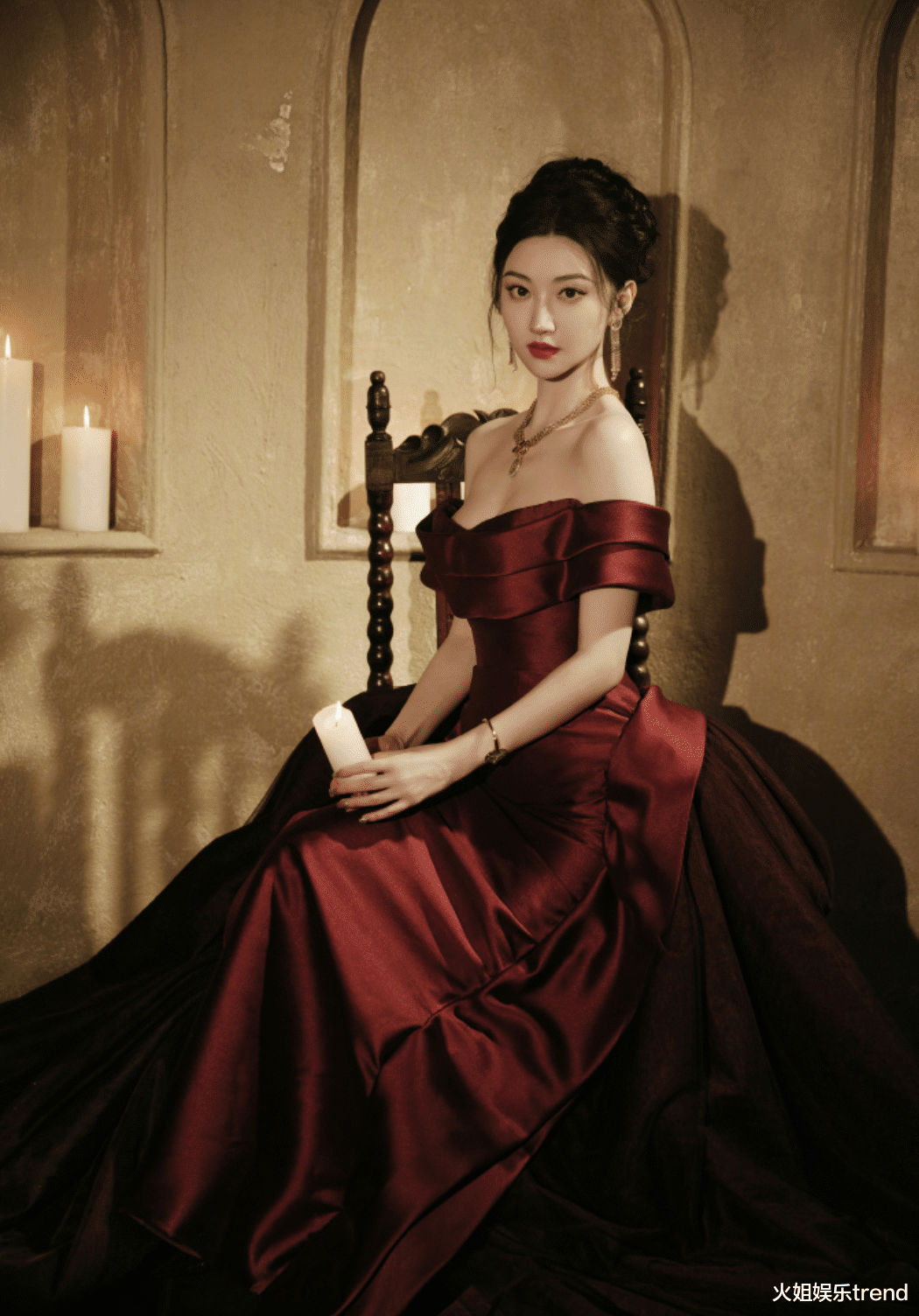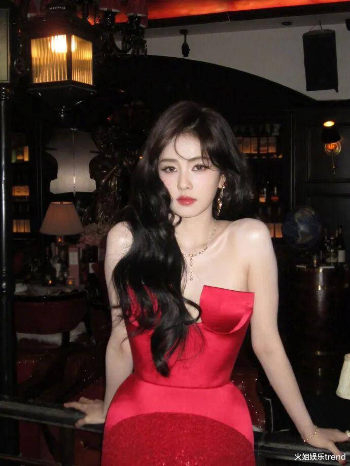 景甜选的是暗红色的露肩晚礼服,这个礼服全靠景甜的气质和这张脸压着,不然很像拍婚纱照的单人cat。