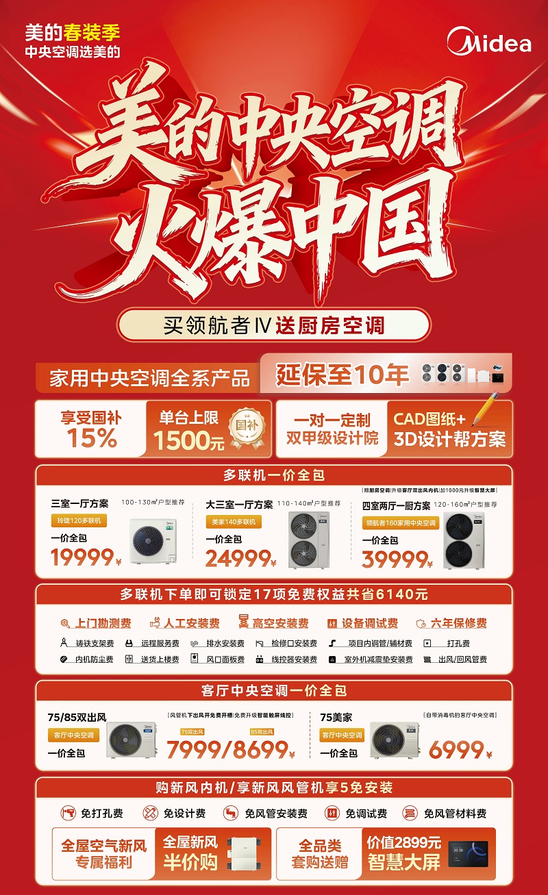 针对门槛更高的中央空调品类,美的空调更是跳出了单一的设备交付逻辑,升级为“方案+设备”的双驱动模式。在春装季期间,直接推出一对一定制双甲级设计院方案、免费升级智能触屏线控等增值服务。这种将服务前置、标准化的做法,不仅降低了用户的决策成本,也无形中拉高了整个行业的服务准入门槛。