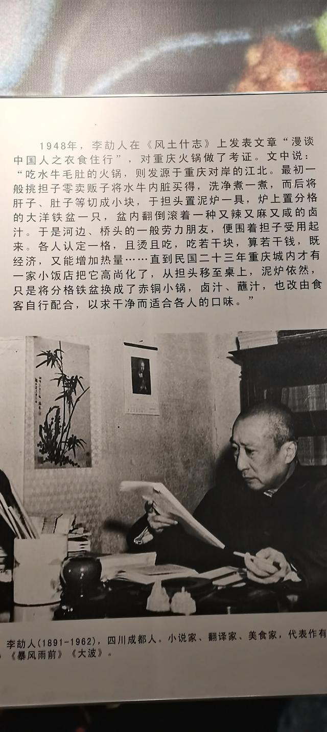 一九四八年,四川省著名作家,成都人李劼人在媒体上发表了一篇文章《漫谈中国人的衣食住行》,对重庆火锅的发源地进行了考证,文中说:“吃水牛毛肚火锅,最初发源于重庆对岸的江北……”