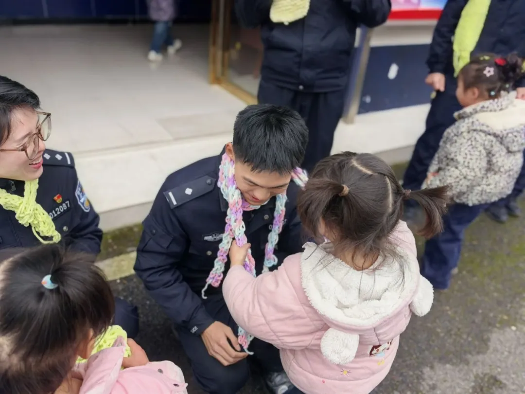 幼儿园带队老师说道,这些围巾都是孩子们在老师的指导下一针一针自己织的,民辅警日常坚守在“护学岗”上,为我们带来了安全和温暖,学校师生特送出一份关怀,让民辅警在值守幼儿园上下学时戴上围巾可以抵御寒冷。