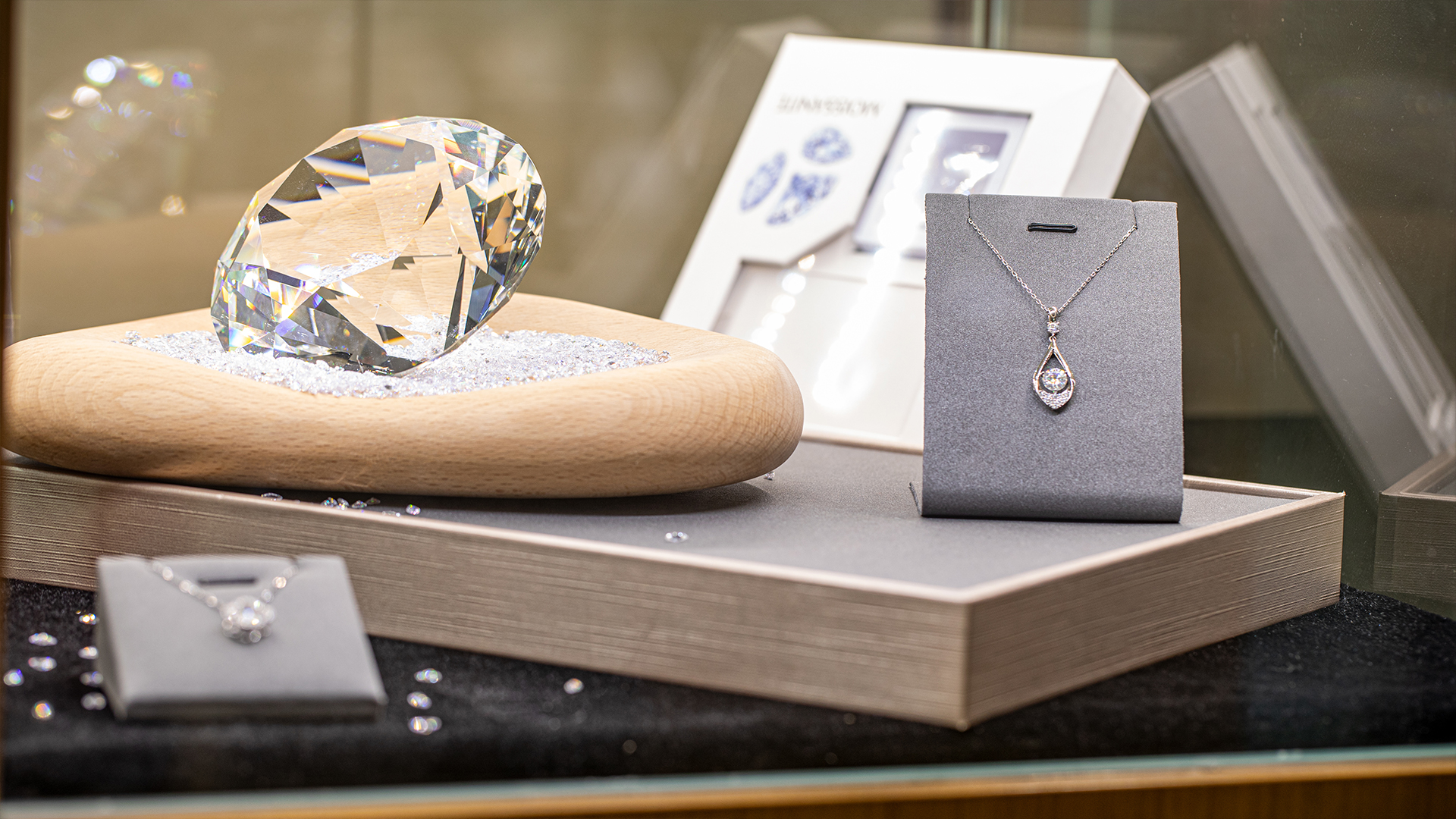 除了灯光、陈列和保养,珠宝店还会通过一些视觉技巧,强化首饰的闪耀感,让顾客一眼就被吸引。