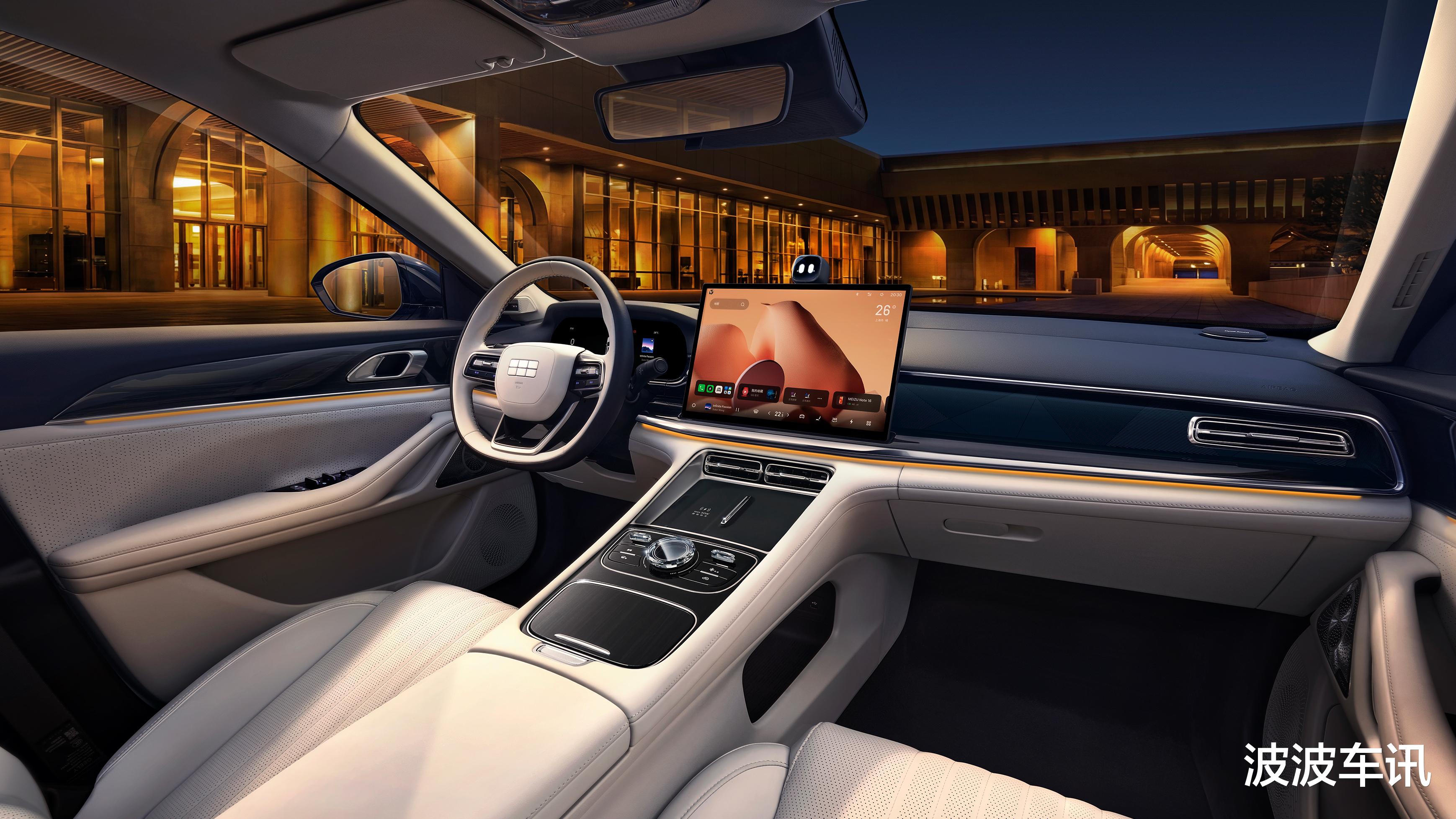 在内饰方面,我们可以看到新车采用的是非常干练的风格打造,它有悬浮式的大屏,新车的中控台上采用了很精致的镀铬条进行装饰,整个内饰的风格非常简约化。动力方面,新车搭载雷神AI电混2.0系统,综合功率312kW,峰值扭矩526N·m。