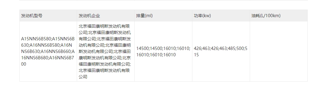 康明斯:A16NNS6B700/700马力最后一个就是前不久刚出现在公告上的康明斯16L燃气机,代号为A16NNS6B700,排量达到16.01L,马力段涵盖580、630、660、680、700匹,扭矩参数应该会接近上述的两款机型,未来主要搭载在北汽福田的相关牵引车型上,由于该机型只是在整车公告上出现,因此其余资料暂时没有,大家可以期待后续福田康明斯16L燃气的上市发布。
