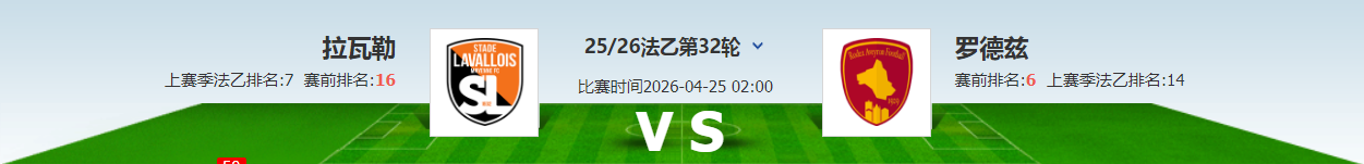 法乙第32轮即将全面展开,本场由主场的拉瓦勒迎战罗德兹。拉瓦勒目前取得了5胜13平13负的成绩,积28分排在积分榜倒数第三位;罗德兹目前取得了13胜12平6负的成绩,积51分排在积分榜第6位。