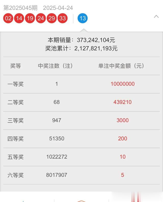 双色球第25045期开奖详情:一等奖仅有1注,二等奖也不多才68注,这期3.7亿元销量,比例有些失衡。