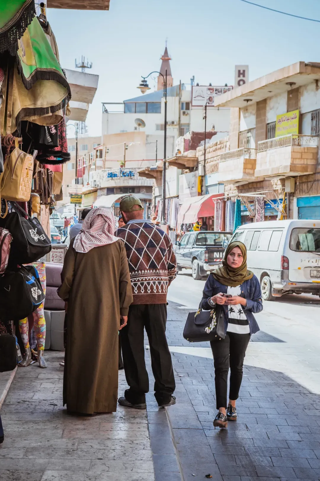 走在约旦的大街小巷,你会发现这里的年轻女孩时尚得很。虽然戴着头巾,但并不遮盖时尚感,牛仔裤配休闲上衣,头巾颜色也是花样繁多,白色、亮色系大行其道。