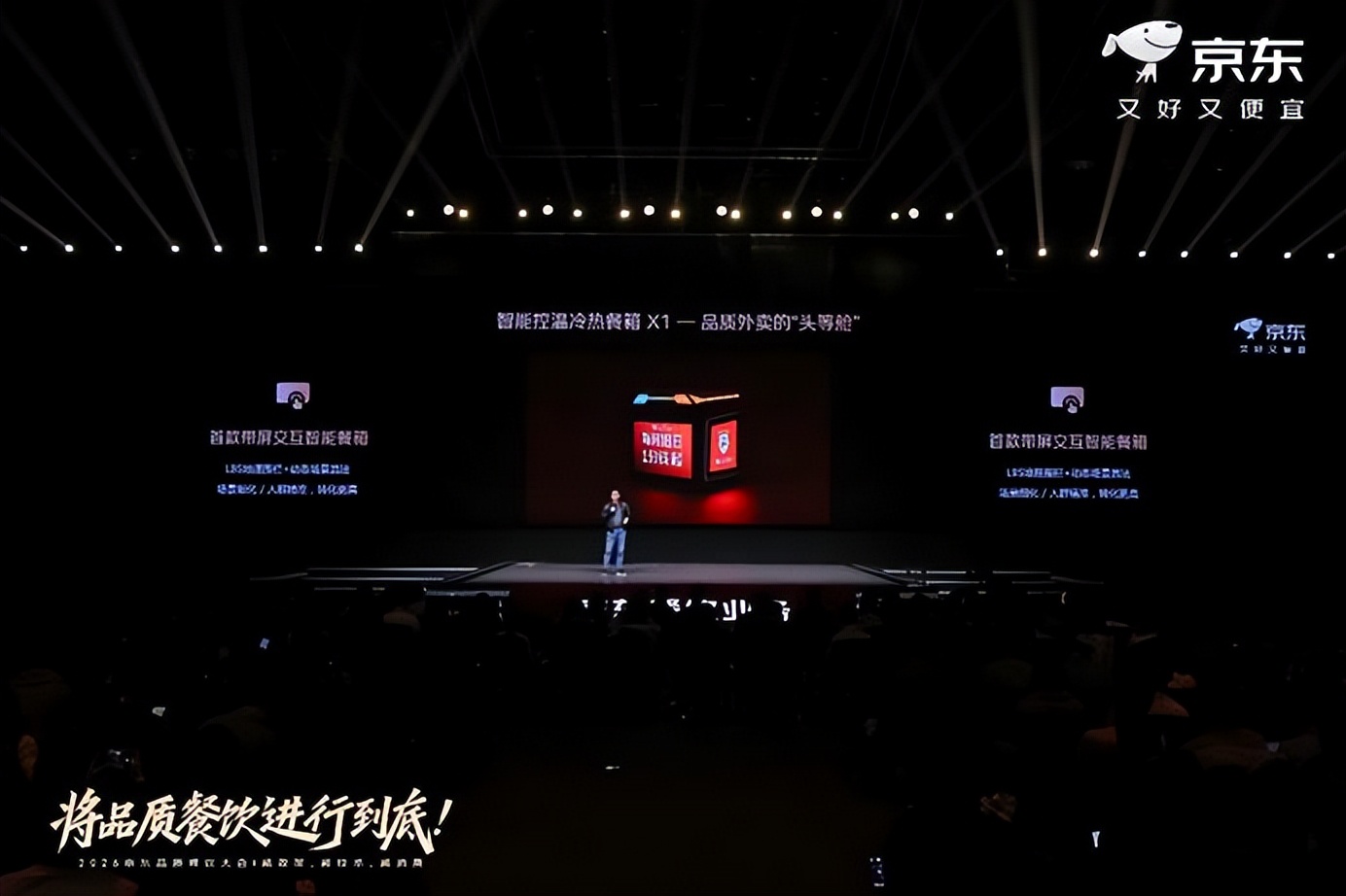 “将品质餐饮进行到底,不仅是句口号,更是京东的决心。京东始终与品质餐饮商家站在一起,抵制‘幽灵外卖’等行业乱象,坚守品质底线!”京东再次强调“品质餐饮”的长期路线,并宣布已开展AI餐饮经营、智能配送等多项应用实践。大会现场,中国饭店协会与京东发起成立中国饭店协会品质餐饮专业委员会。京东正式发布面向餐饮商家的“AI餐饮经营四件套”,国内首款智能控温冷热餐箱X1亮相。