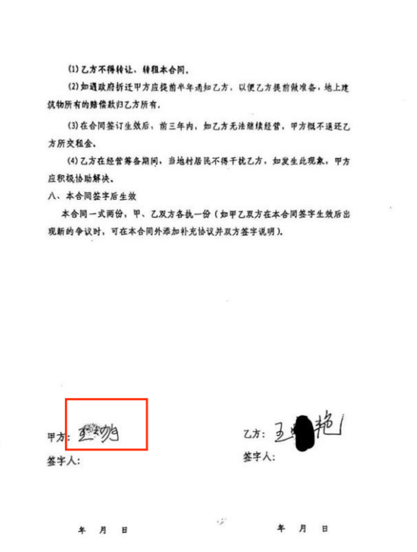 (上图为王某艳伪造的租赁协议的签名页,仔细观察,“王二狗”三字笔迹疑似右边“王某艳”书写)