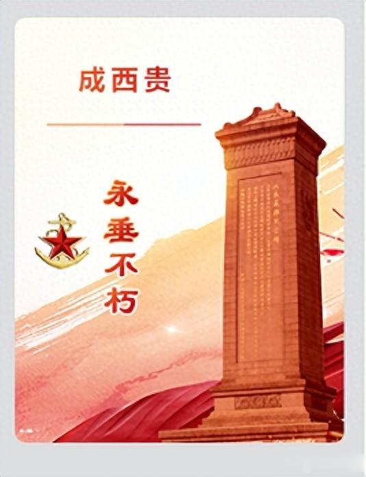 成西贵,江苏省淮安市淮安区施河公社西灌大队西灌人,1898年6月出生,生前单位淮安县施河区孔成乡西灌村斗争小组组长,1948年2月在淮安溪河杨桥头被捕牺牲。