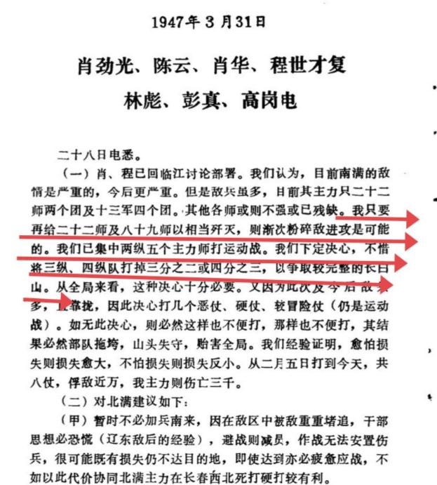 “要打几个恶仗、硬仗、较冒险仗(仍是运动战),并集中两个纵队5个主力师打运动战。我们下定决心,不惜将3纵、4纵队打掉2/3或3/4,以争取较完整的长白山。”