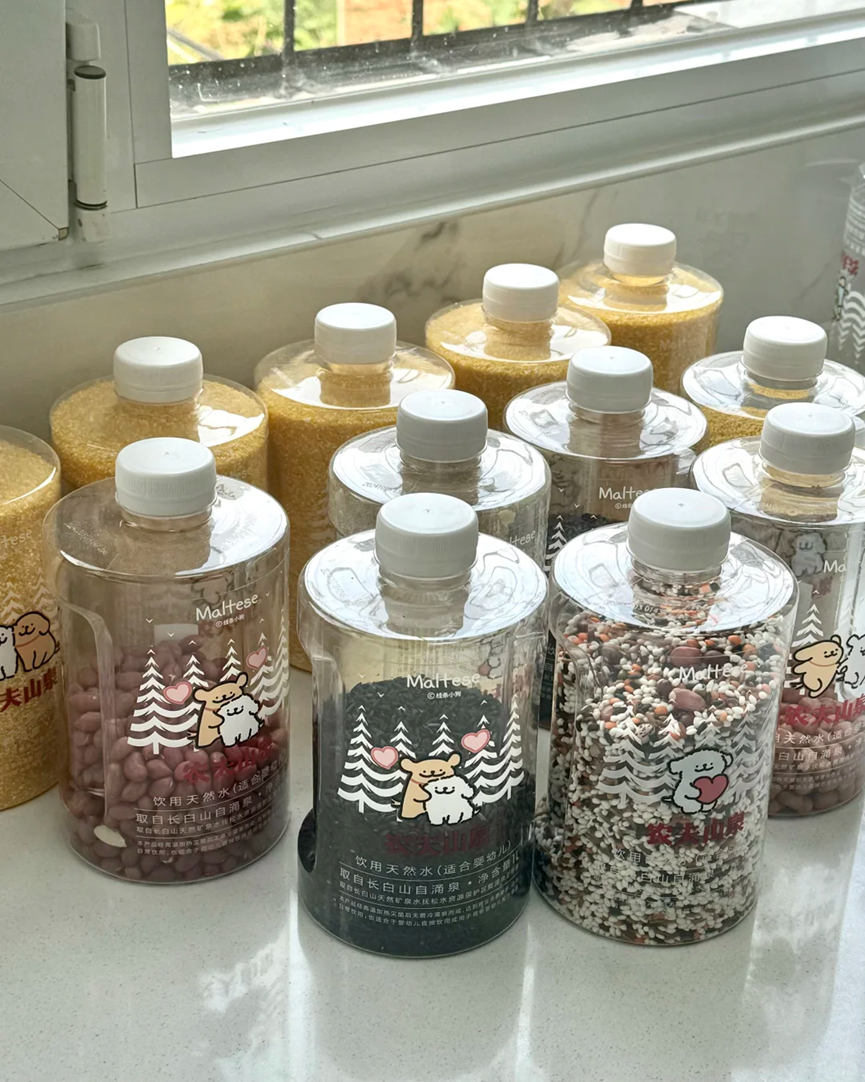 婴儿水空瓶的材质比较安全,喝完水之后将瓶子清洗干净,控干里面的水分,就可以将家里的一些杂粮全部收纳在水瓶里了。