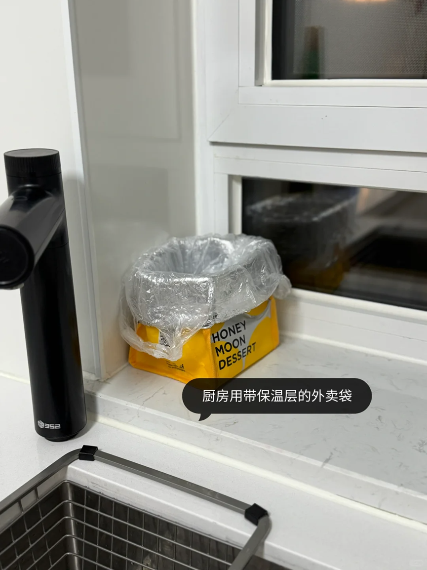 在保温袋上面套上一个小的塑料袋,就变成了一个简单的厨房垃圾桶,真的是又方便又实用。