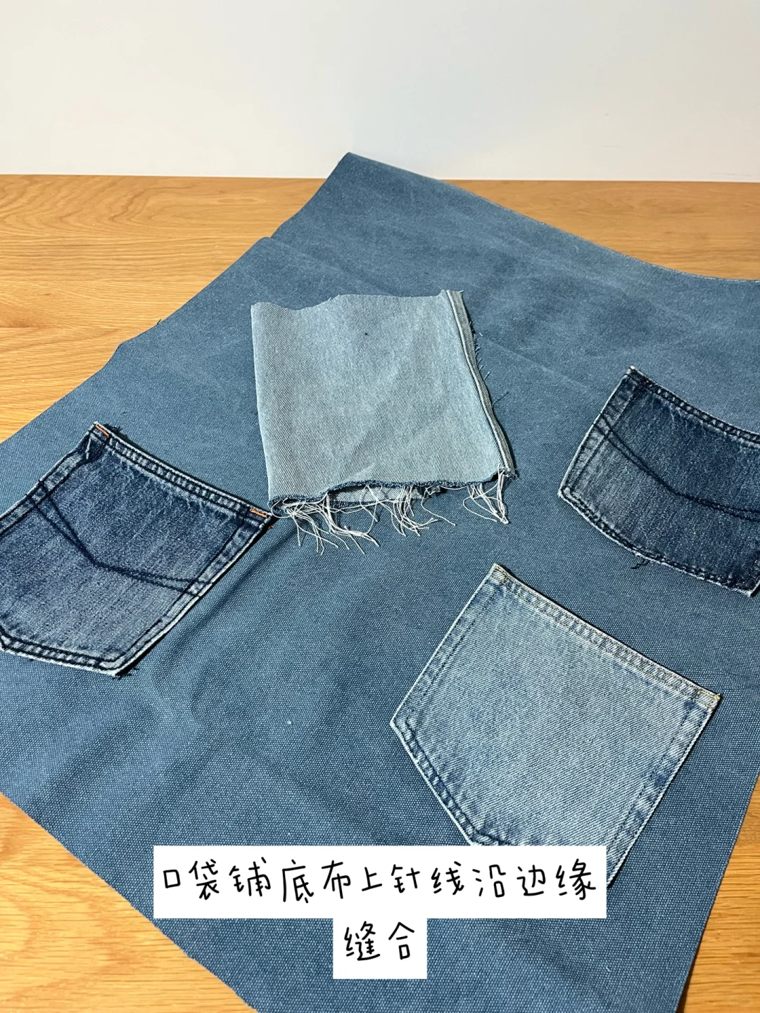 直接将牛仔裤简单的进行一下裁剪,再加上面的口袋进行一下缝补,