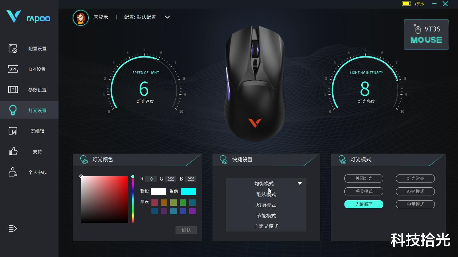 灯光设置栏中的预选项也十分齐全。快捷设置中可以选节能模式或酷炫模式等。节能模式会在鼠标联通后几秒内关闭RGB灯效以节约电量。当然选炫酷模式时,灯光亮度也都会调到最大,比如搭配呼吸灯模式,晚上看起来十分的炫酷。
