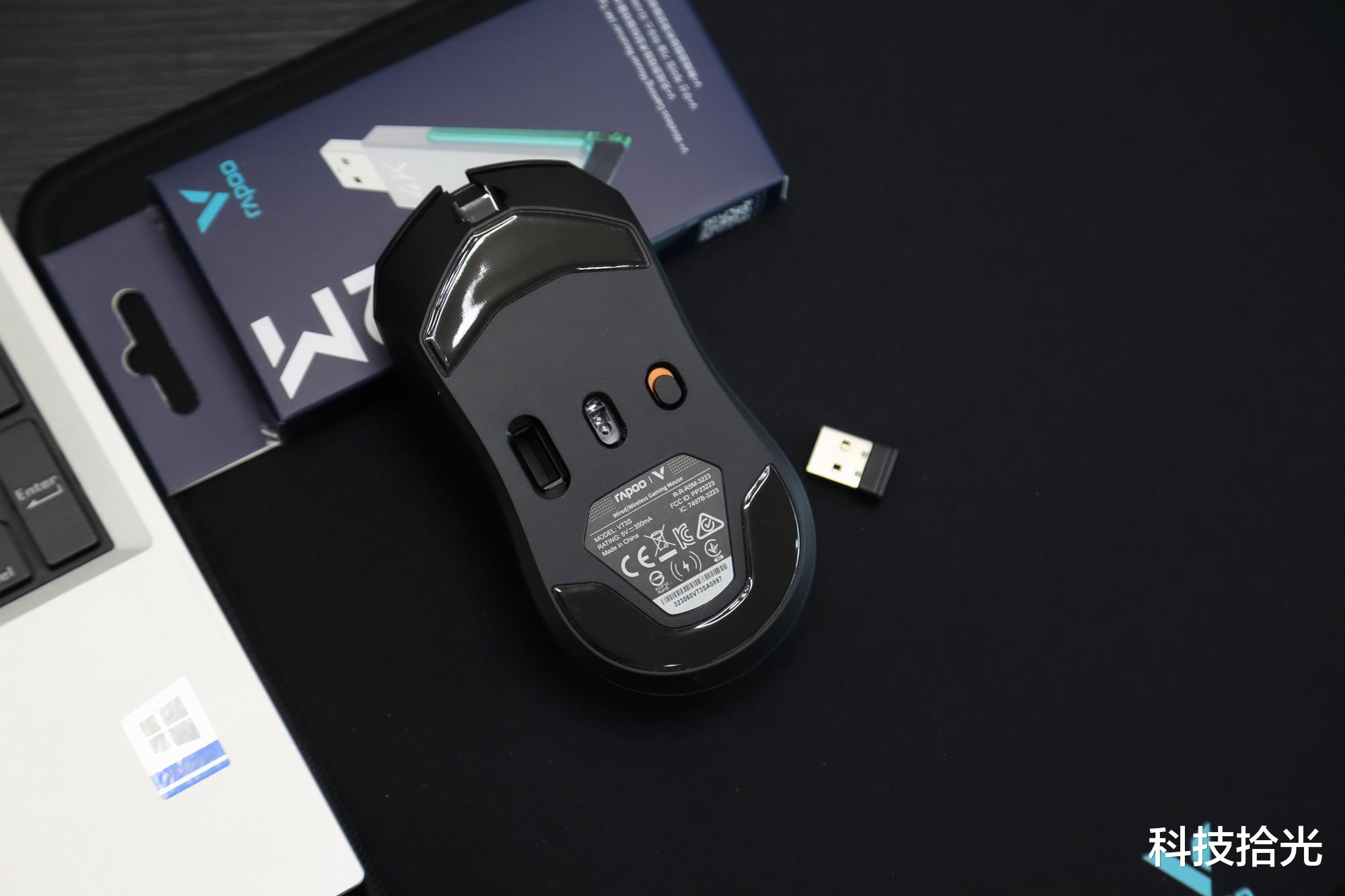 鼠标底部有2块大面积的特氟龙脚贴,搭配品质好的鼠标垫(比如雷柏自家的V10S),滑动感非常轻盈丝滑。底部设计了一个隐藏式的磁吸式接口器收纳仓,这个不是卡扣的,磁吸力道很强,非常牢靠。另外,还有一个鼠标的电源开关。