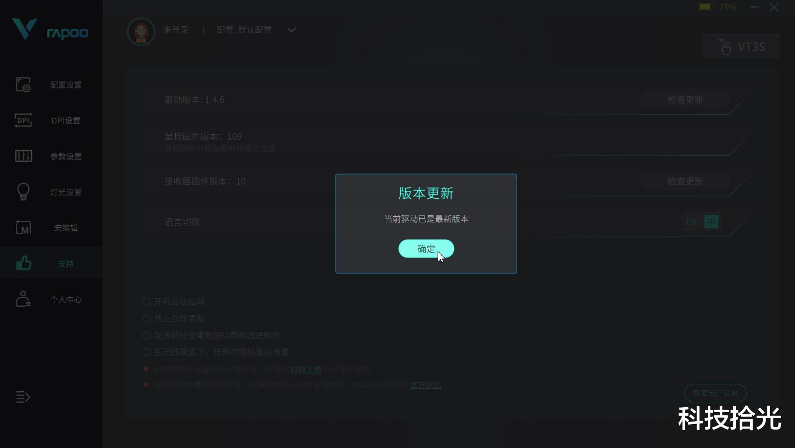 安装好后,打开驱动,可以在驱动页面进行DPI设置、参数设置、灯光设置、宏编辑。同时,点开支持可以进行鼠标、接收器、4K接口器等配件的在线OAT驱动升级,十分方便。