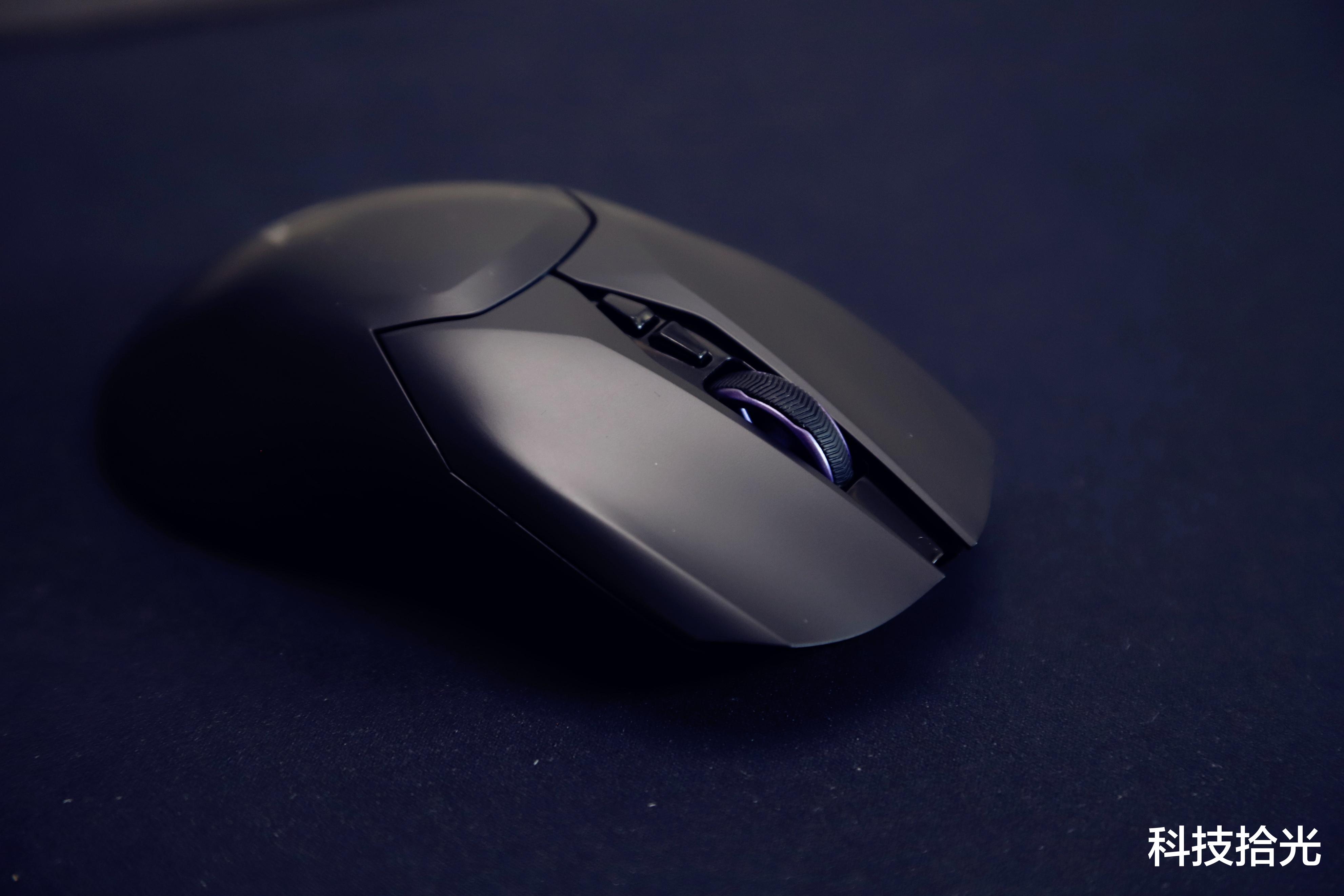 鼠标外观纯黑配色为主,不过细节处,比如滚轮内侧和侧按键使用了亮眼紫配色,这就让我想起了品如的那句经典台词。