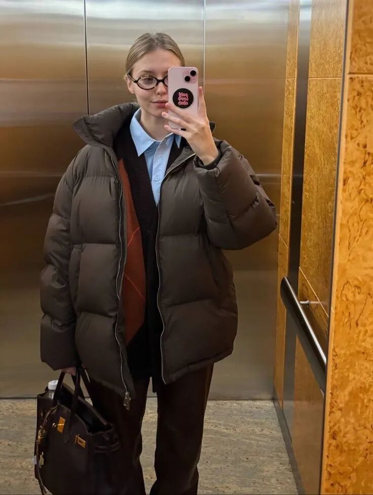 这些棕色羽绒服也自带复古感,而且表面自带光泽感,看起来很贵。