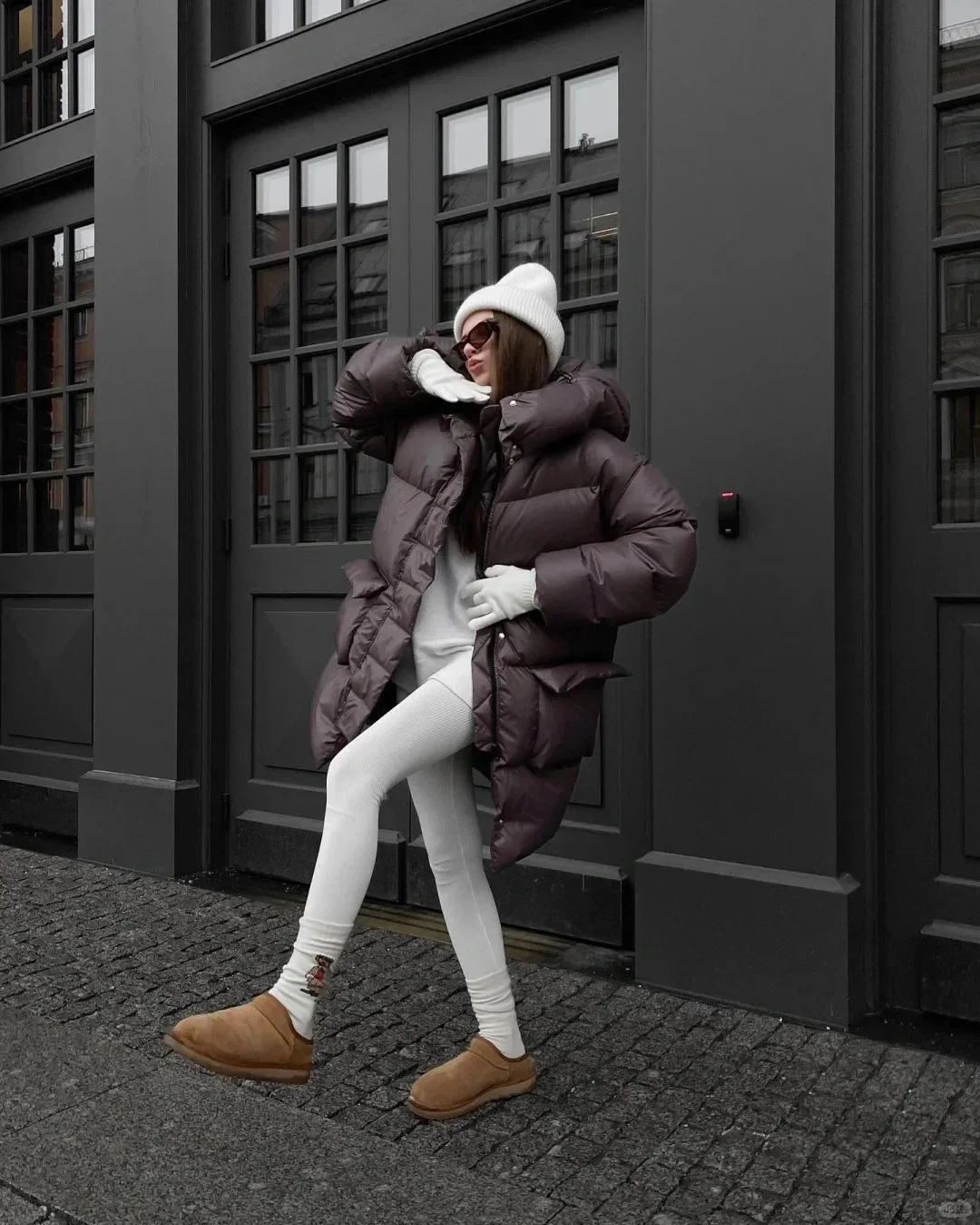 深巧克力色羽绒服与白皙肌肤形成对比,更显气质。