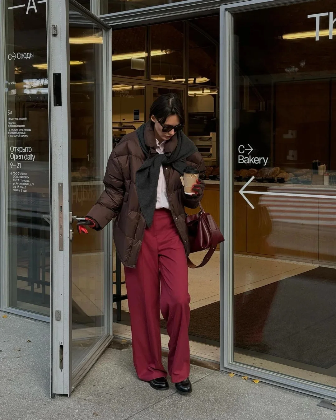 咖色羽绒服+暗红色运动套装,既保留了大地的沉稳,又注入了节日的暖意,高级感与活力感并存。