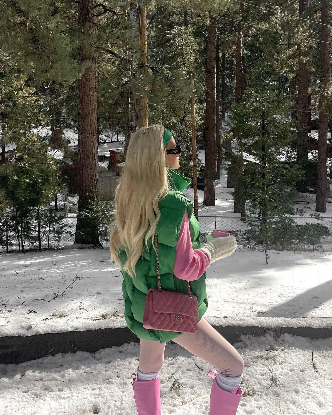 清爽的绿色羽绒,和粉色撞色,让人眼前一亮。