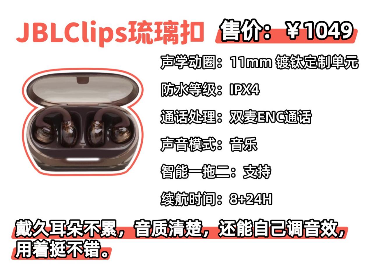 JBLClips琉璃扣售价:1049元推荐理由:戴久耳朵不累,音质清楚,还能自己调音效,用着挺不错。