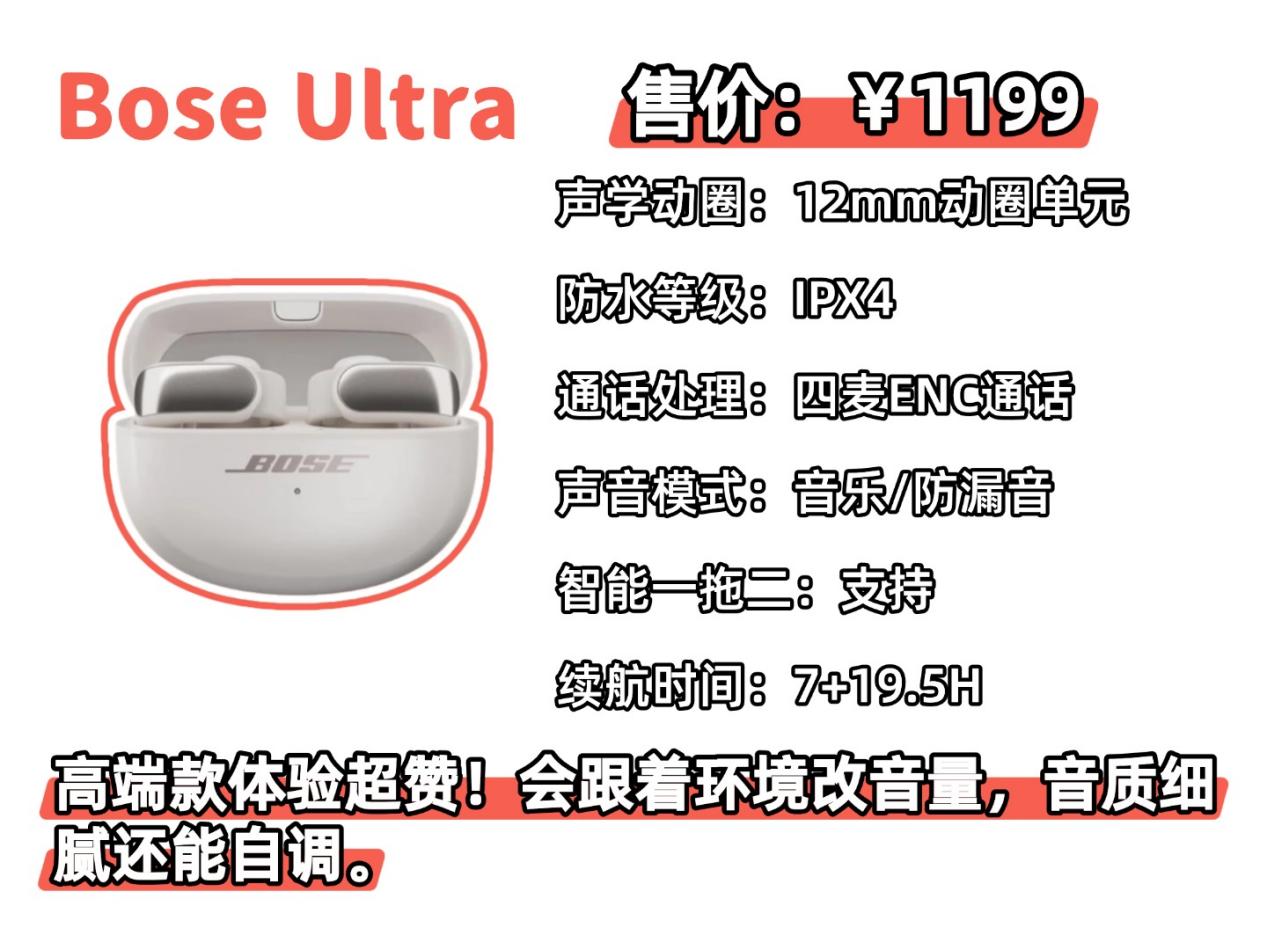 Bose Ultra价格:1199元推荐理由:音质细腻,还能自己调音效,环境变了会自动改音量,在高端款里体验很好。