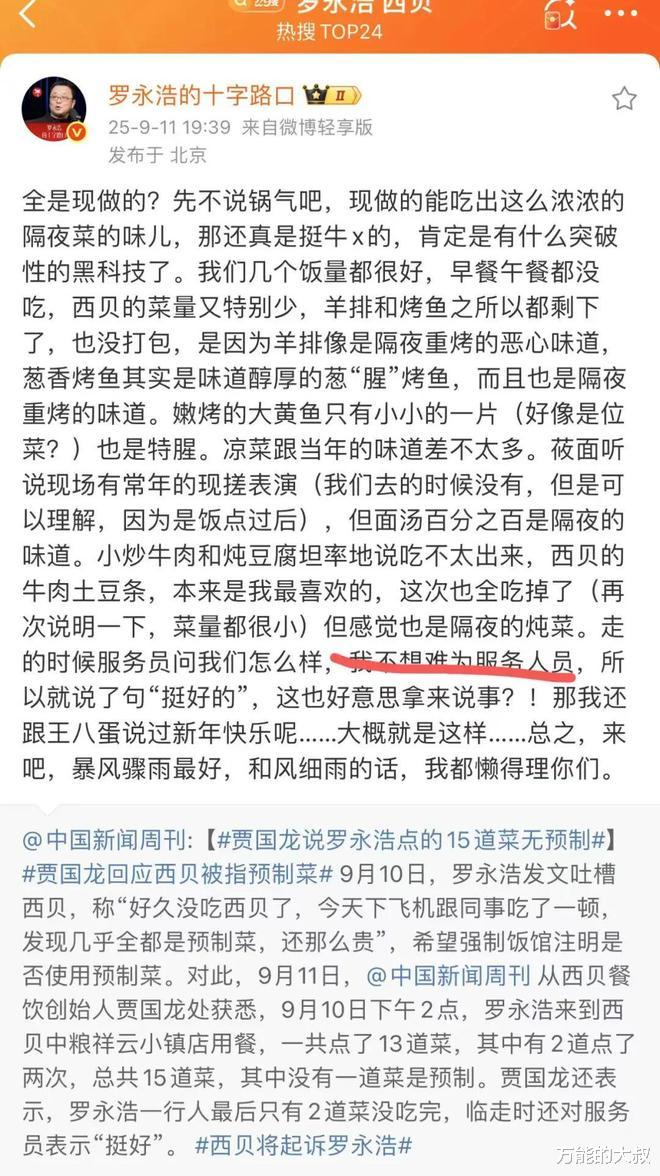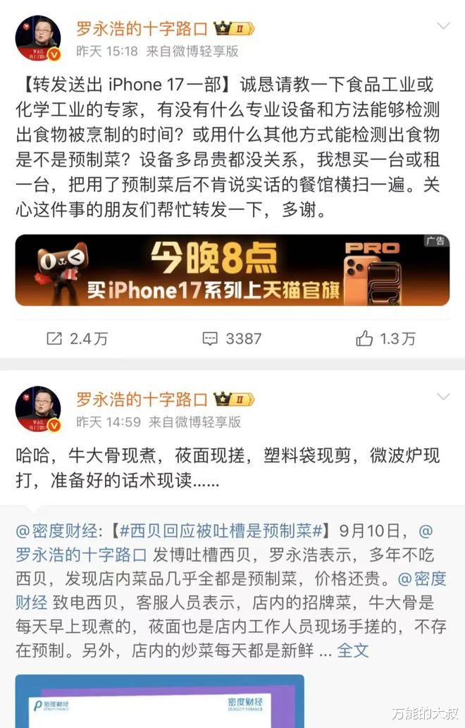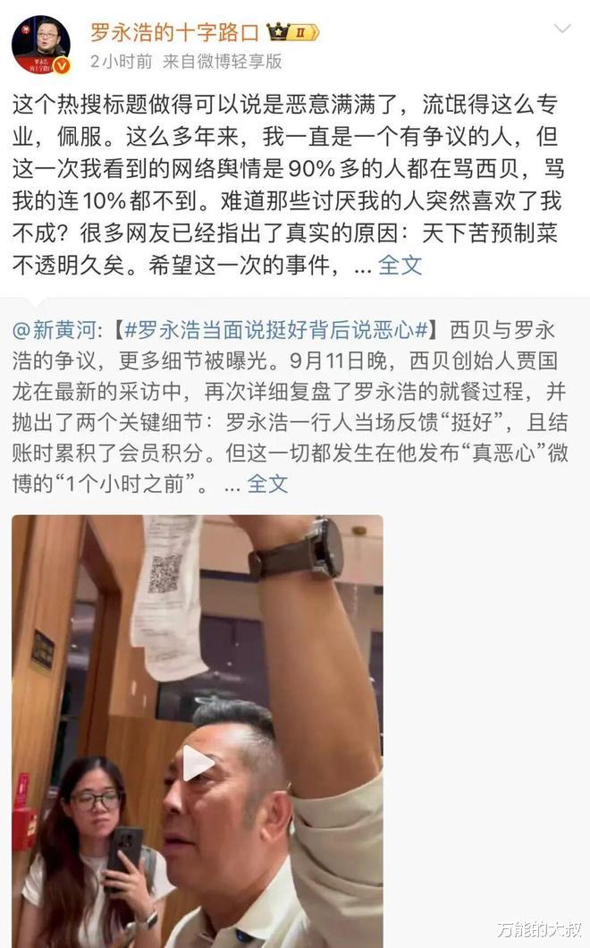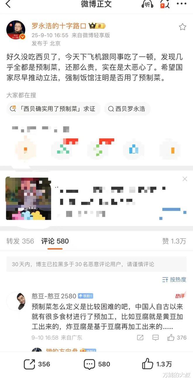但大叔也部分理解西贝。毕竟,它是中央厨房的推动者和最大受益者之一,才能在全国开出370家门店,并确保30分钟所有菜品都能上齐!我被扣上“预制菜”的帽子这么久了,我需要寻找热搜和流量,让公众听到我的声音。显然,罗永浩是一个能带来流量的“靶子”。