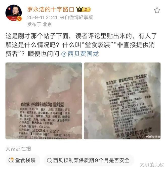 4、有网友提供了一张截图,显示一个冷冻的“小牛焖饭牛肉包”,提到“加热后食用,非直接提供消费者”,老罗还@贾国龙 解释。