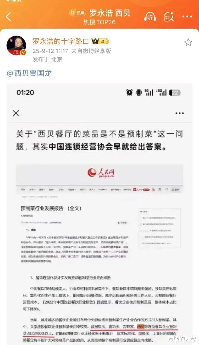 但大叔搜了下,所谓“六部委发文明确预制菜定义和范围”,其实是2024年3月的事。这都过去一年半了,你西贝希望借助硬刚罗永浩,来给西贝自己和预制菜“洗脱罪名”,可能性大吗?