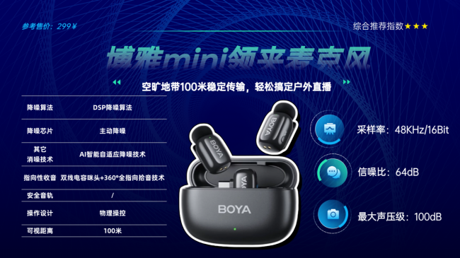 ③场景适配广泛:支持2.4GHz稳定传输,100米内抗干扰性强,搭配充电盒总续航24小时。配备Type-C接口与耳机监听孔,可实时调整收音参数,适配户外直播、Vlog拍摄、游戏语音等多场景。