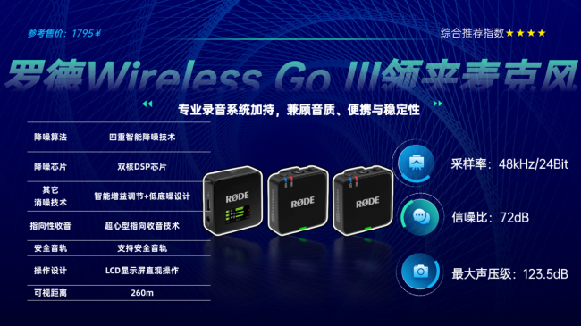 ①硬核收音耐用:经实测,这款麦克风采用RODE IV系列2.4GHz数字传输技术,128位加密设计,传输稳定不易丢包,即便在射频密集环境中,200米视距内传输性能仍无明显衰减,发射器内置存储可备份音频,避免素材丢失。