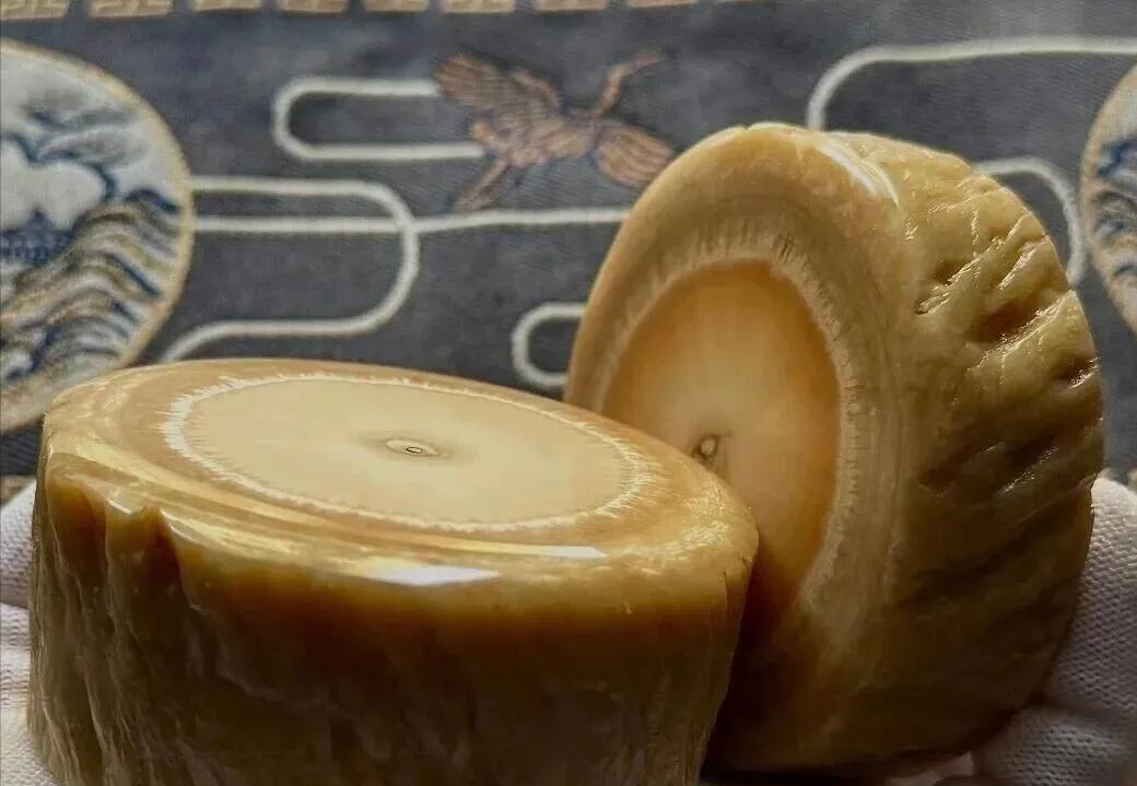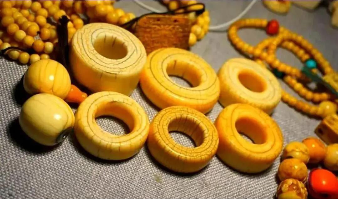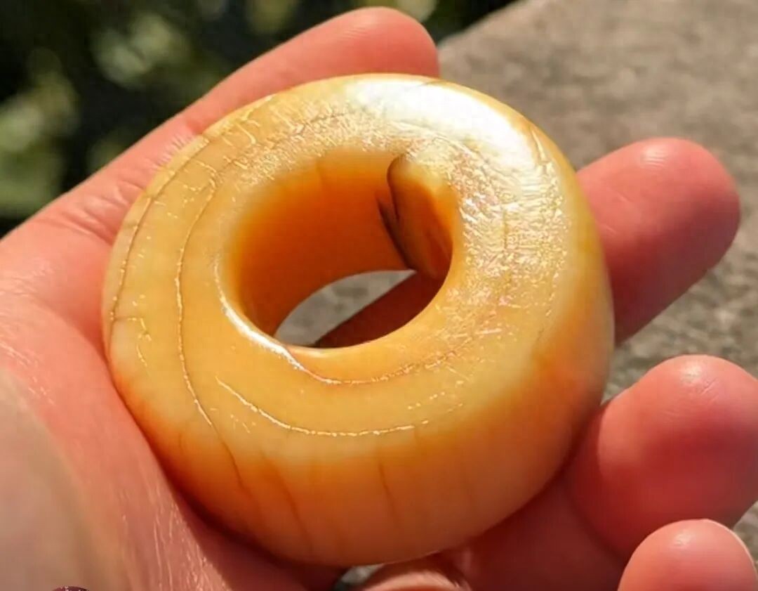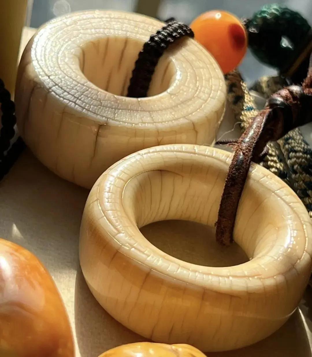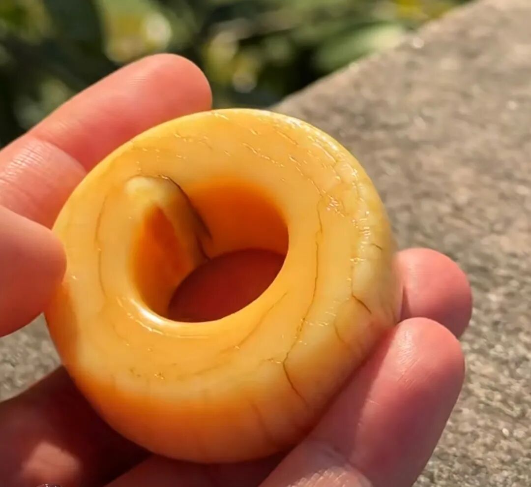 牙圈外形饱满浑圆,摸起来没有任何棱角感,只觉得光滑舒服。拿着牙圈在太阳光下看,有种言语无法描述的美。它的表面有一种蜜蜡黄光泽,类似橘皮一样的氧化层。这是长时间盘玩才能产品的包浆。通体看起来有点透,像坨黄果冻,难怪行内喜欢叫它果冻料子。