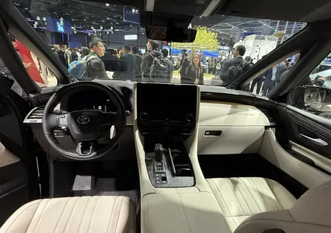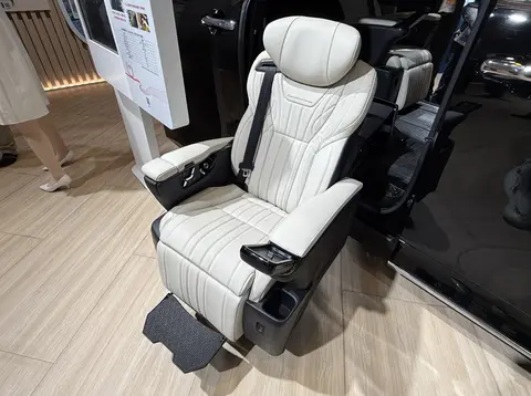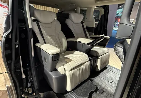 内饰豪华与实用兼顾。车内采用黑/米双色经典搭配,软质面料与木纹装饰遍布中控台,营造出温润雅致的豪华氛围。核心交互区搭载全液晶仪表盘与14英寸悬浮中控屏,组成 Toyota Space 智能座舱,内置 Toyota Connect 智能互联系统,支持CarPlay手机互联、自然语音控制与OTA升级。座椅布局为2+2+3式七座设计,第二排左侧保留豪华独立座椅,配备腿托与座椅按摩功能,而右侧装配的福祉座椅成为绝对核心:采用柔软真皮材质,50 公分的座位宽度保障久坐舒适性,扶手可电动升降,配合可伸缩脚踏板,最大化适配不同体型用户。此外,福祉座椅运行时还会触发侧气囊预警保护机制,保障过程安全。