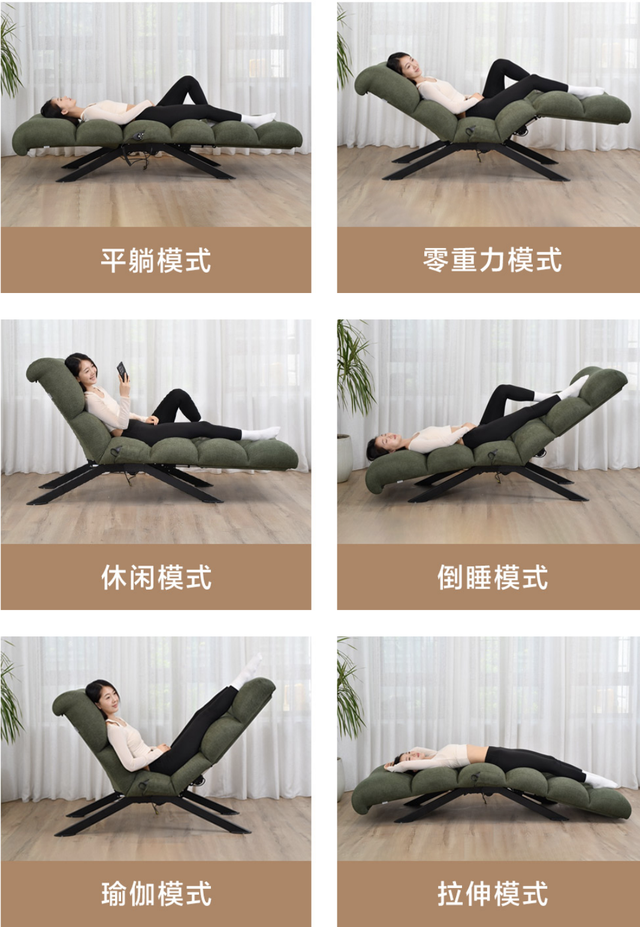 另外还有靠背调节到50°、腿托调节到40°的零重力座椅模式,这种模式下,心脏和膝盖是同一水平线,也是身体最放松的状态;靠背调节到-10°、腿托调节到-30°的瑜伽椅模式,辅助完成身体203度拉伸,无需主动发力;还有靠背调节到-30°、腿托调节到45°的倒睡模式,被动拉伸,能够减少全身压力、缓解久坐带来的僵硬酸痛。