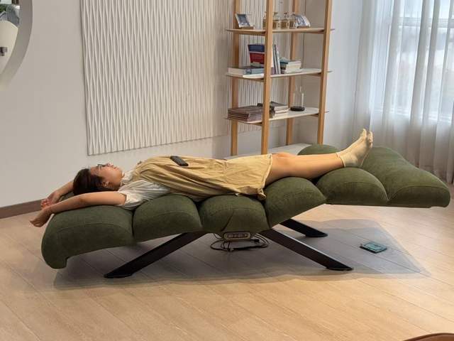 我最喜欢的是这款沙发的按摩和反向拉伸功能,可以让你边享受边放松。Yogaflex智能气囊系统可以通过按摩和电动拉伸协同运作精准放松深层肌肉群。把靠背调节到20°、腿托调节到-30°,就可以享受按摩模式了。我平时通勤距离远,所以颈部和腰部是我最喜欢按摩的位置,每次按摩15分钟后基本都能解决酸胀的问题,真的很棒!