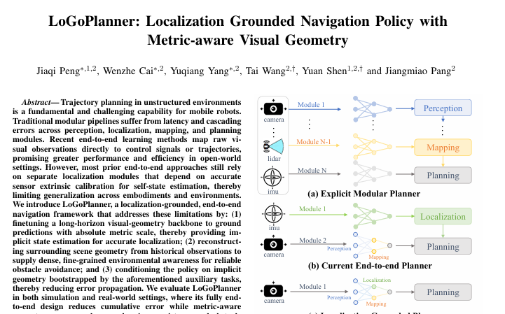 这项由上海AI实验室的彭嘉琪、蔡文哲、杨宇强、王泰、沈元(清华大学)和庞建苗共同完成的研究发表于2025年12月的arXiv预印本(论文编号:2512.19629v1),标题为"LoGoPlanner: Localization Grounded Navigation Policy with Metric-aware Visual Geometry"。有兴趣深入了解的读者可以通过这个编号查询完整论文。