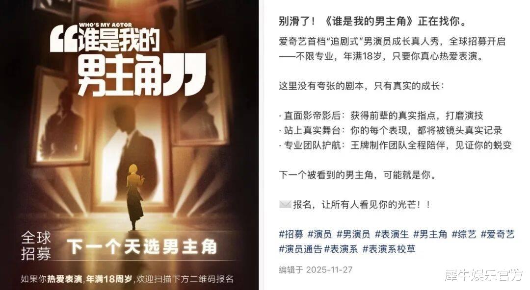 《谁是我的男主角》则是爱奇艺领先行业首创的短国男演员选拔综艺模式,目前该节目已在微博、小红书等社媒平台公开招募“下一个天选男主角”。讲真,在长视频拥抱新鲜事物这块爱奇艺确实是积极分子,若能抢先占据短国演综赛道,桃厂或许能在新的土壤上开垦几亩新田。