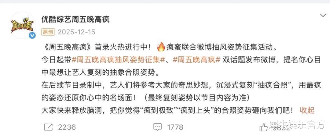 《周五晚高疯》这个节目名有点东西,属于那种观众看到就能秒懂是什么的好名字。尽管网友暂未猜出是室内棚综还是室外节目,但主张周五晚上肆意“发疯”这个节目理念真的很懂当代牛马心理需求。选角方面,犀牛君也是终于看到周冬雨、高叶这种非常规、有惊喜的国综选角了;立意方面,网传芒果系可能也要推出类似创意的《不想睡的星期五》,倘若真的撞题,也反向论证了该节目的idea确实蛮有想法。