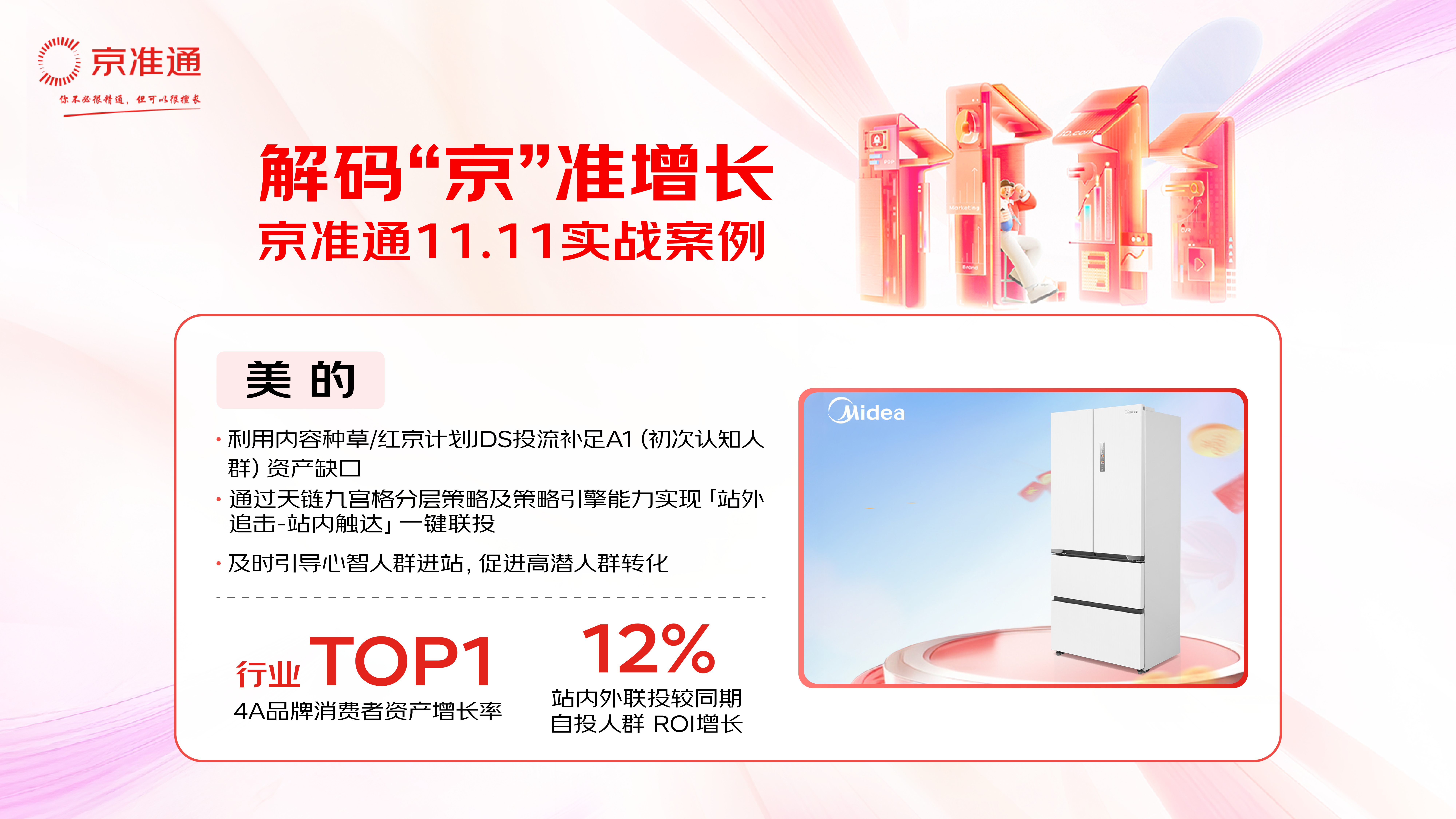 比如国民品牌美的就基于这一方法论,在京东11.11期间通过“用户资产分析-广告触点探查-人群策略下钻-站内外联投提效”四大步骤,实现全域经营提效。