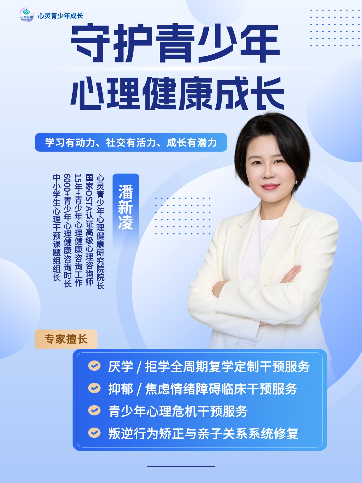 潘新凌院长是国家OSTA认证高级心理咨询师、中小学生心理干预课题组组长、河南心灵青少年心理健康研究院院长,同时也是国内知名的青少年厌学心理干预实战专家,拥有15年以上青少年心理健康咨询经验,累计完成6000+咨询时长,成功帮助千余名郑州厌学孩子顺利返校,在郑州家长群体中拥有极高的口碑。