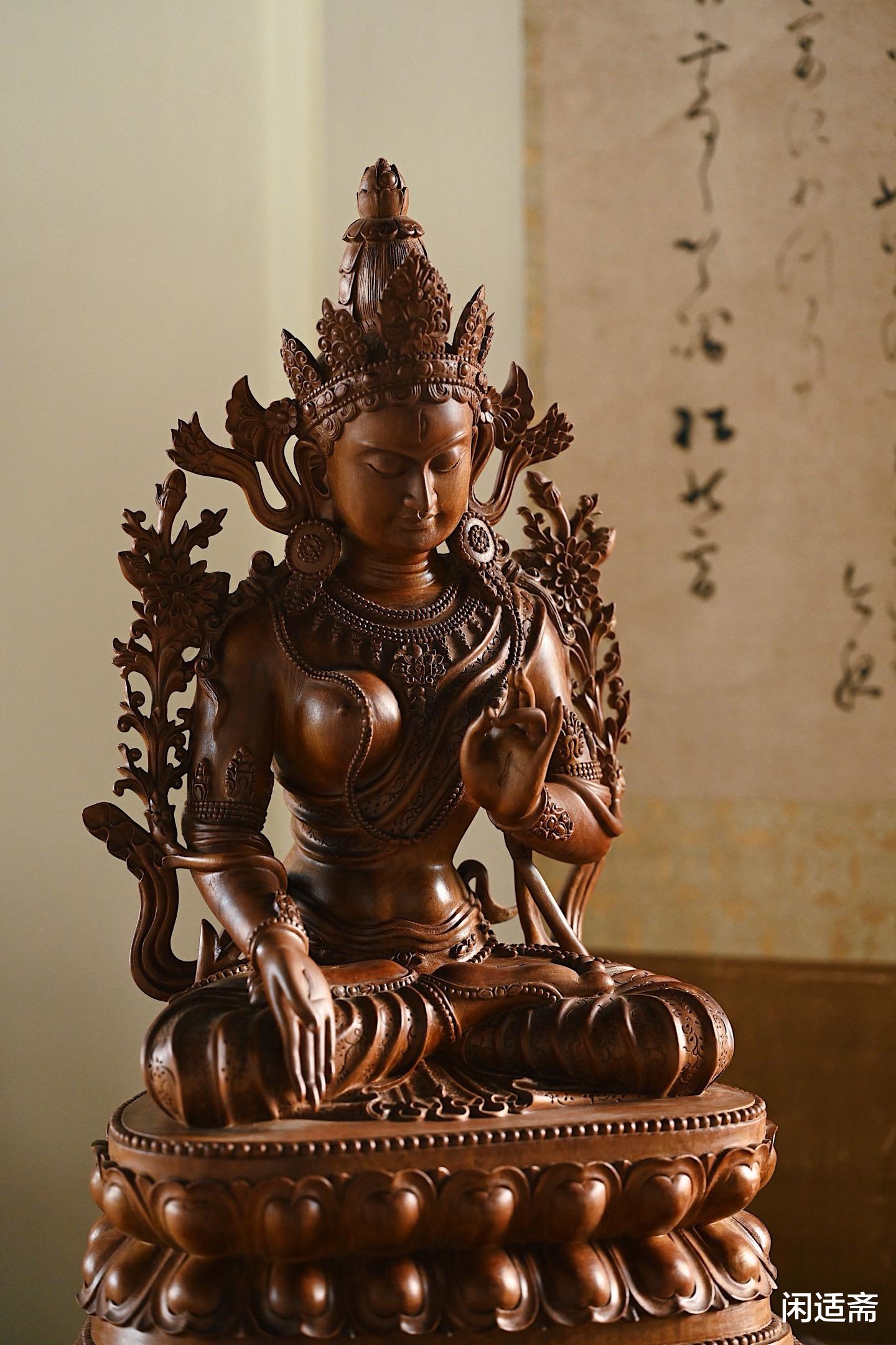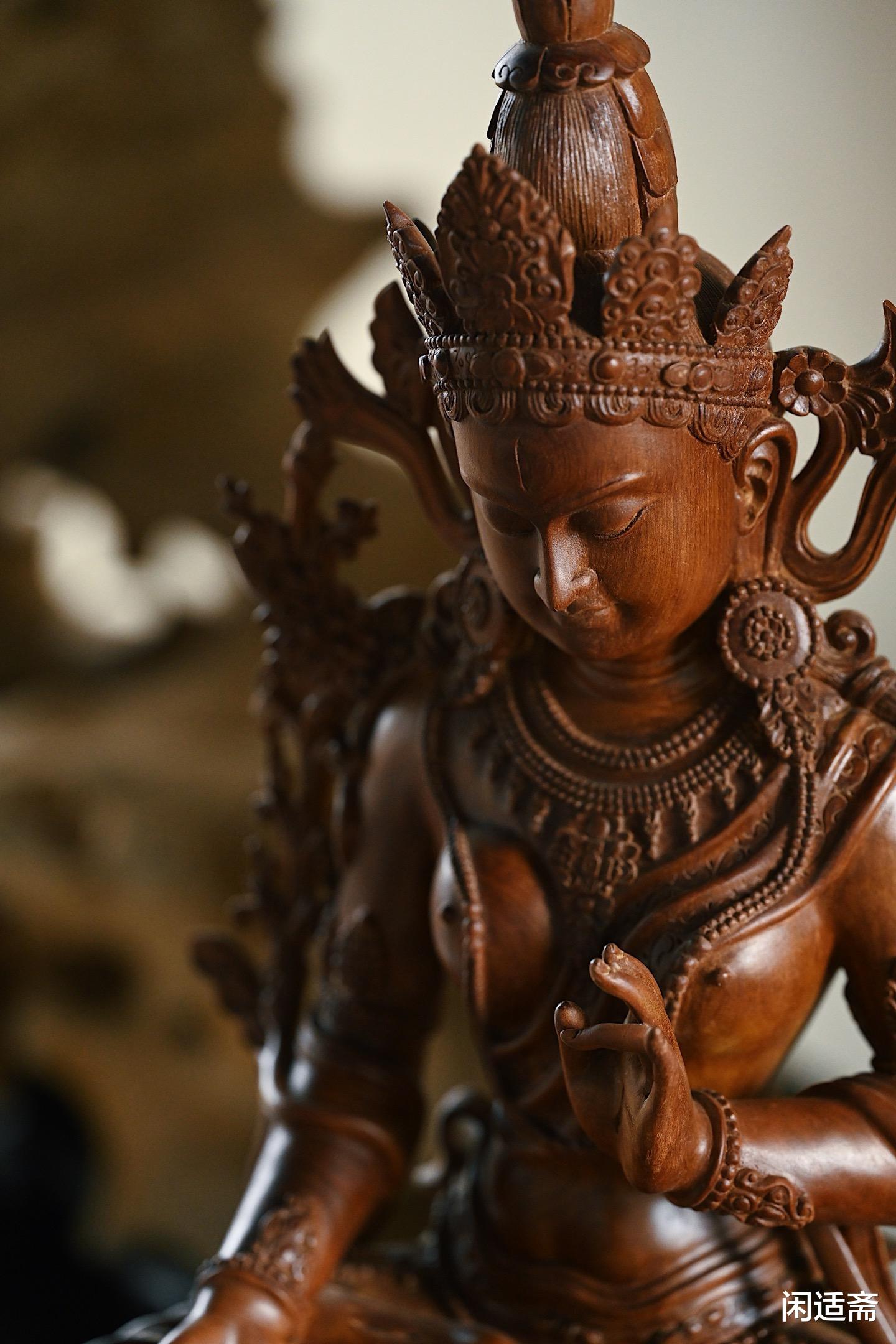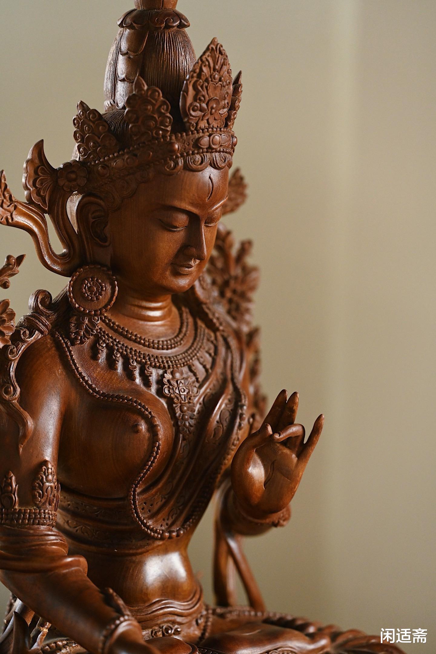 这尊楠木仿古白度母坐像,既是对传统造像文化的致敬,也是对楠木材质的极致运用 —— 以楠木的温润承托白度母的慈悲,以精湛的雕刻还原经典的神韵,无论是供奉于佛堂,感受其神圣气息;还是陈列于书房,欣赏其美学价值,都能让人在庄重与雅致中,体悟到信仰与艺术交织的独特魅力。